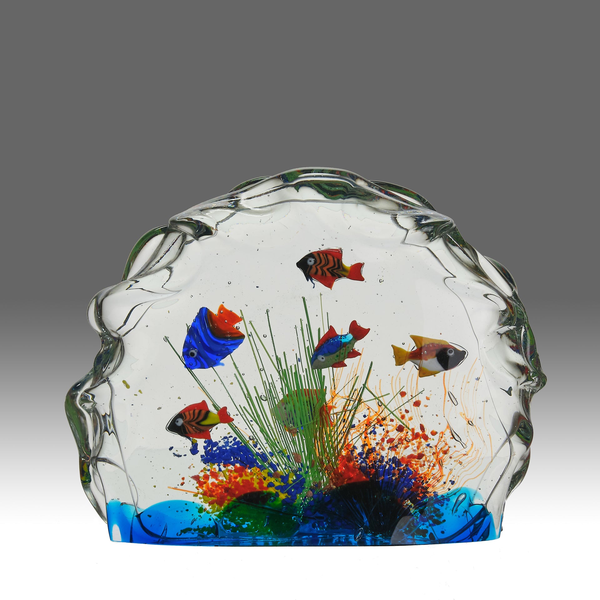 A highly attractive hand-blown glass sculpture from Murano, depicting an aquarium or undersea landscape featuring multi-coloured tropical fish and reeds incorpoarting 'murrina' glass rods in the sommerso technique to embed the elements into glass 'tank' of this enchanting aquarium, capturing both motion and fluidity with striking realism. Signed to base A Barbini and Murano