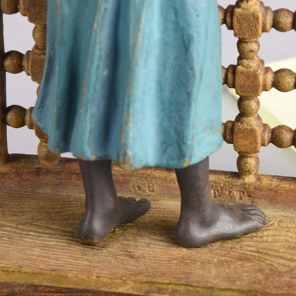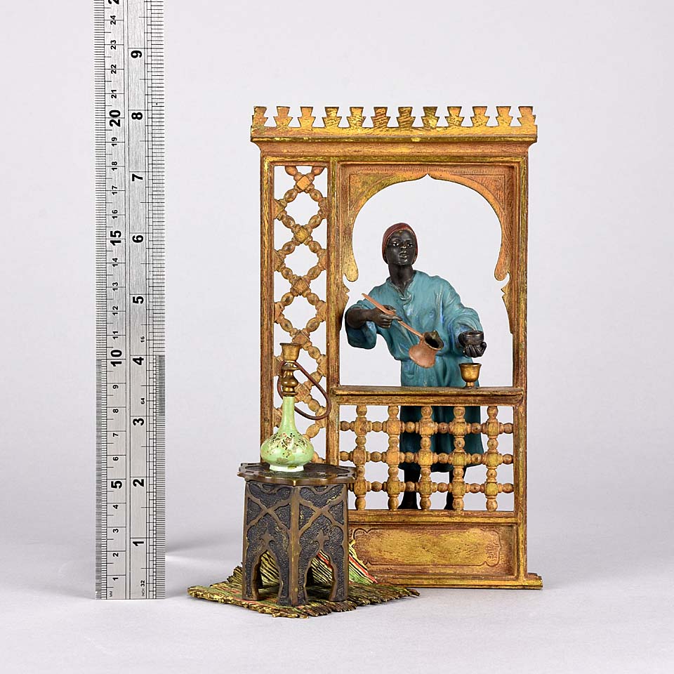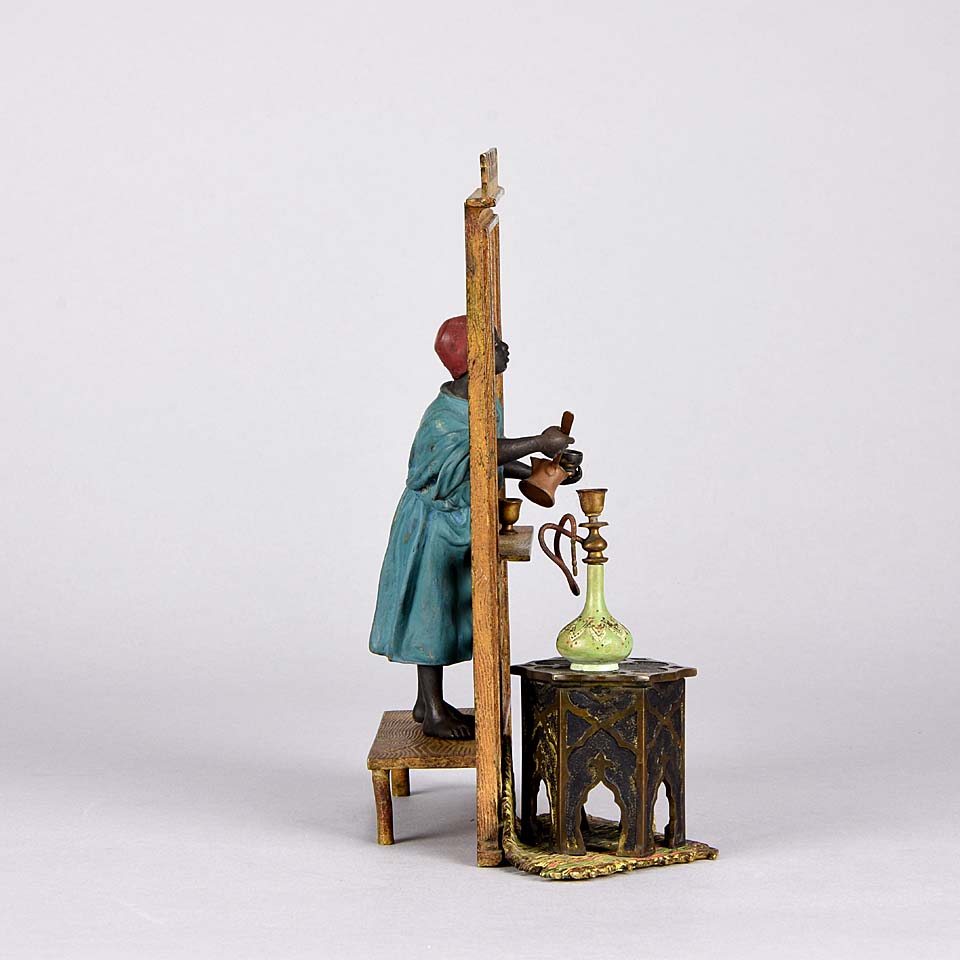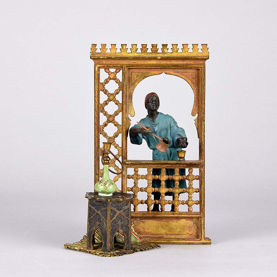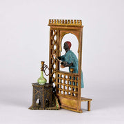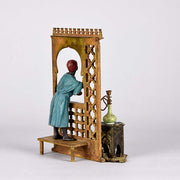 From the 17th Century onwards it was customary for the young Victorian gentleman to go on the obligatory tour of the East – the Grand Tour – as an educational rite of passage. Visiting countries and experiencing customs they had only ever heard about in stories, these young men were keen to show their families mementos of their experience, especially the lavish subjects of the Middle Eastern Arab world like the Bergman Arab with his pipe. The return trip would usually include a visit to Vienna, and here the ‘souvenir’ shops supplied a plethora of beautifully crafted sculptures with an Orientalist Arab flavour. These were often acquired to show their friends and families images of their travels. Bergman was noted for his detailed and colourful work and he produced a huge number of Orientalist subjects to cater for this market including this Arab bronze Coffee Vendor.