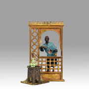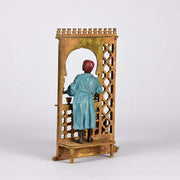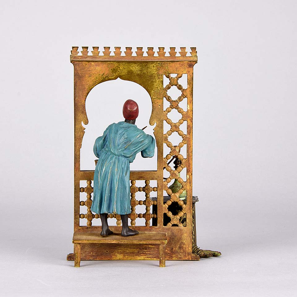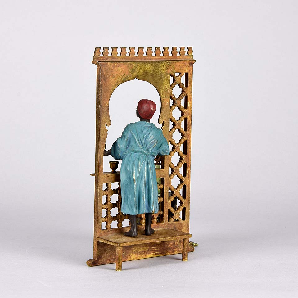 A fine Austrian cold painted bronze study entitled ‘Arab Coffee Vendor’ by Franz Bergman – of a young Arab man passing coffee through an architectural window. The bronze with excellent colour and very fine hand finished detail, signed with the Bergman ‘B’ in an amphora vase