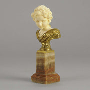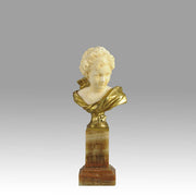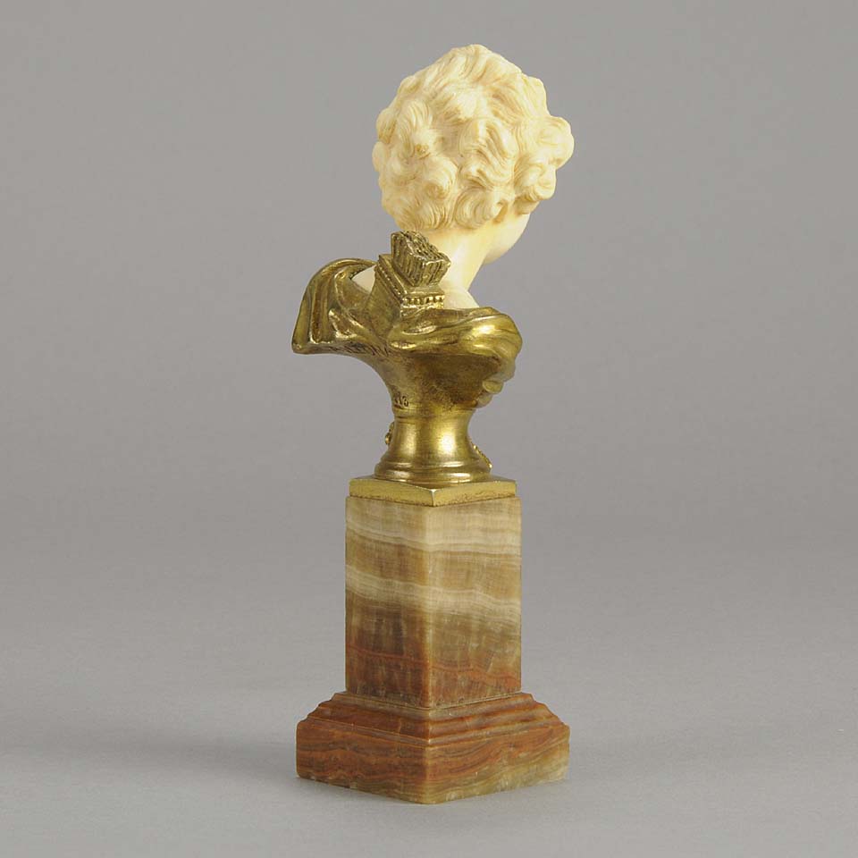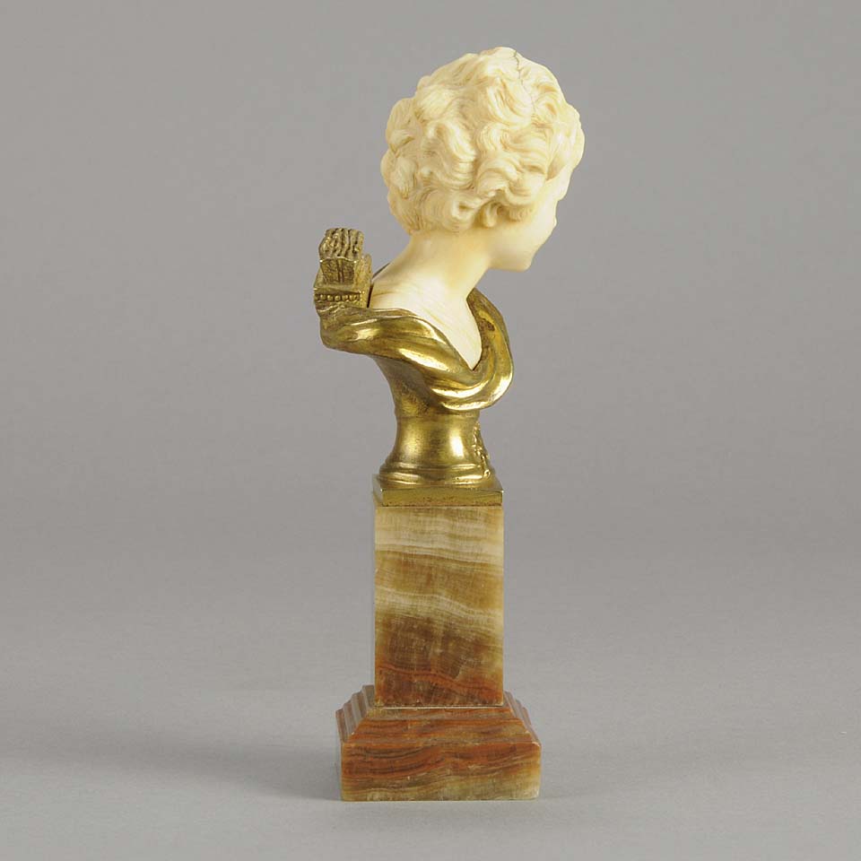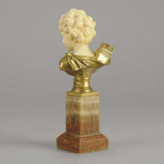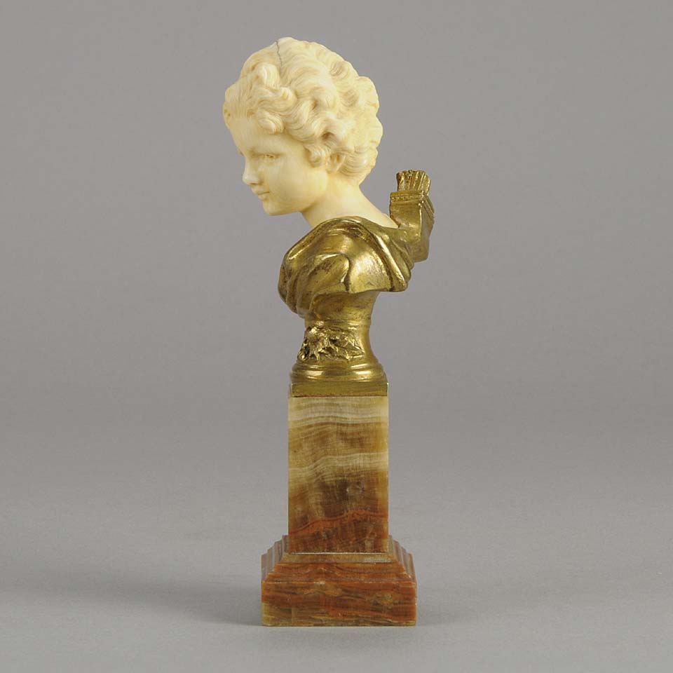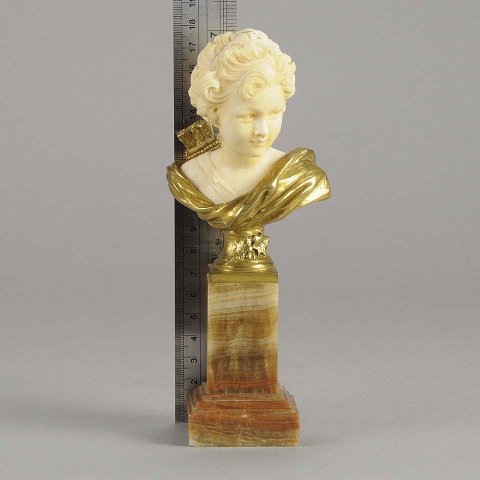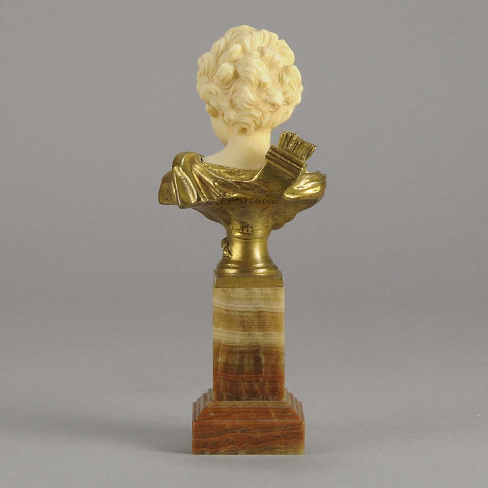 An excellent classically inspired early 20th Century gilt bronze and hand carved ivory bust of Cupid, the God of Love, carrying a quiver full of arrows with intricate hand carved detail and colour. Raised on a marble base signed A Leonard and numbered.