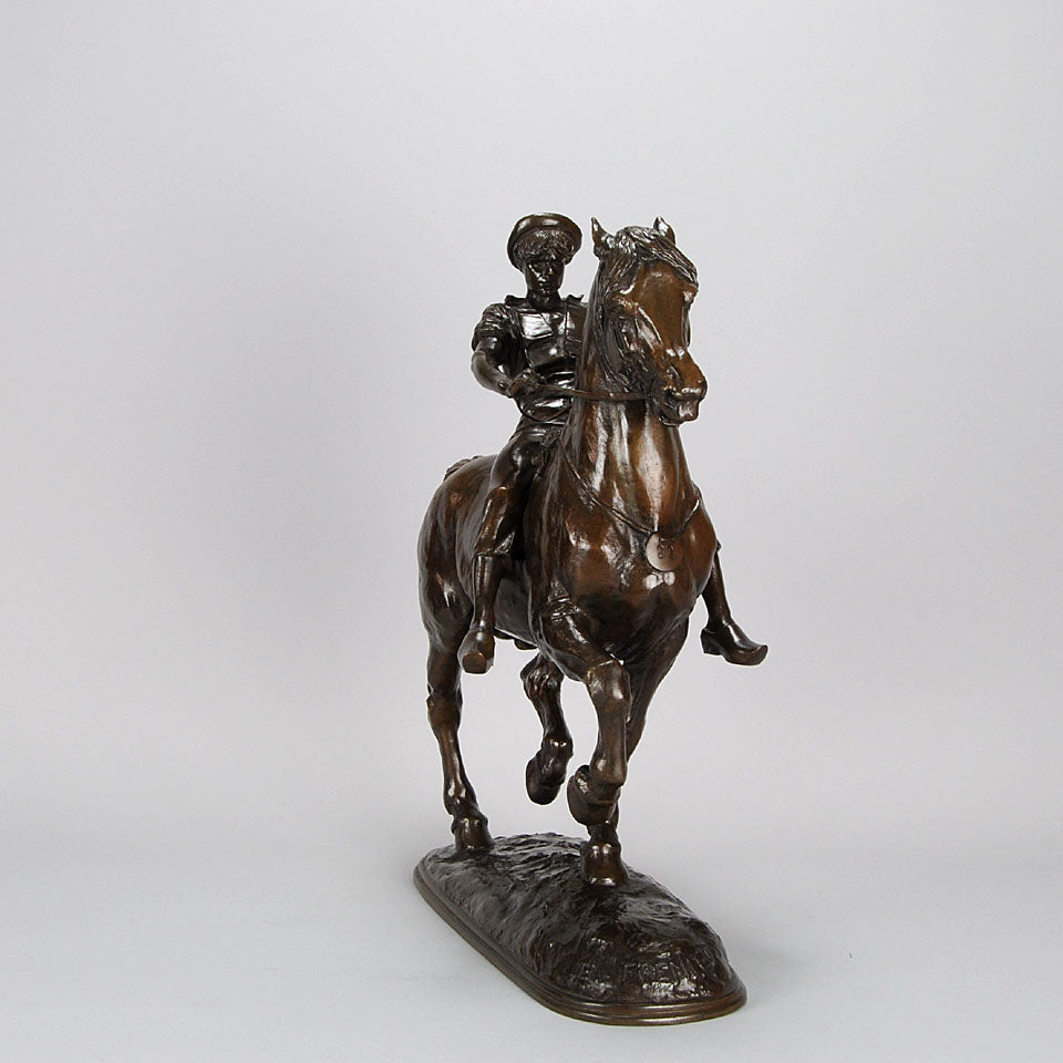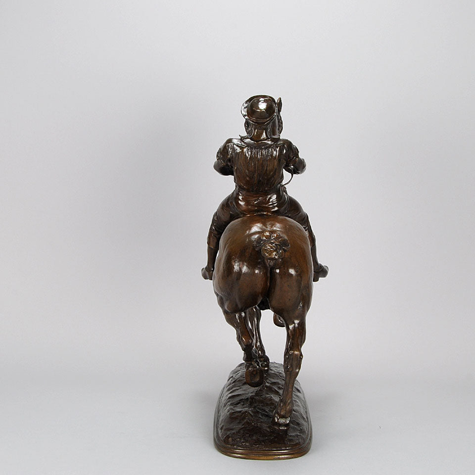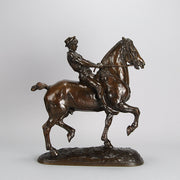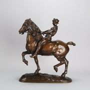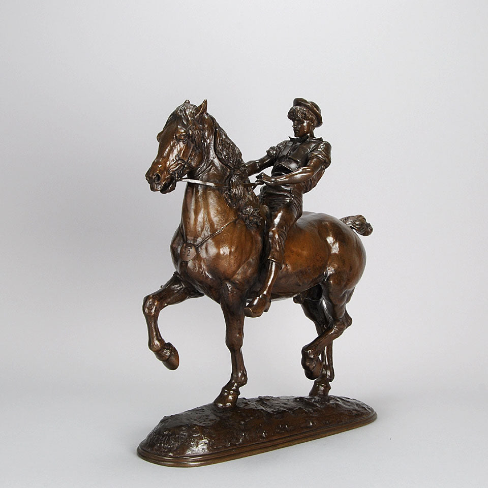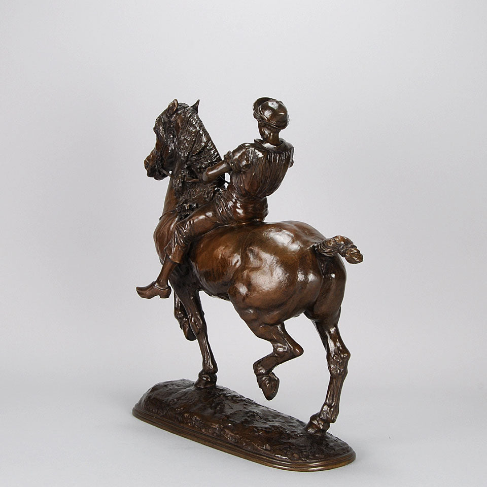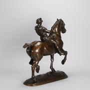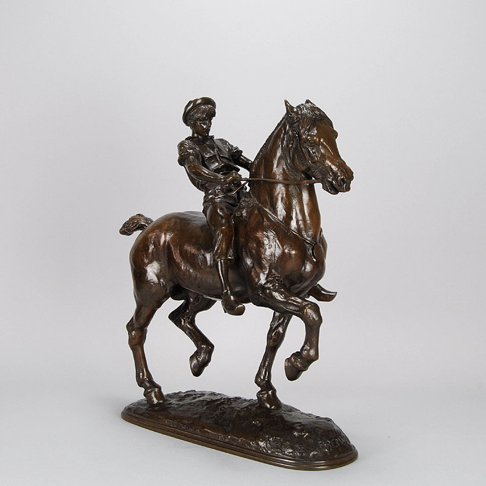 Impressive late 19th Century French bronze study of a powerful steed being ridden by a young lad with extremely fine hand chased surface detail and rich brown patina. Raised on an integral naturalistic dome shaped base, signed Fremiet.