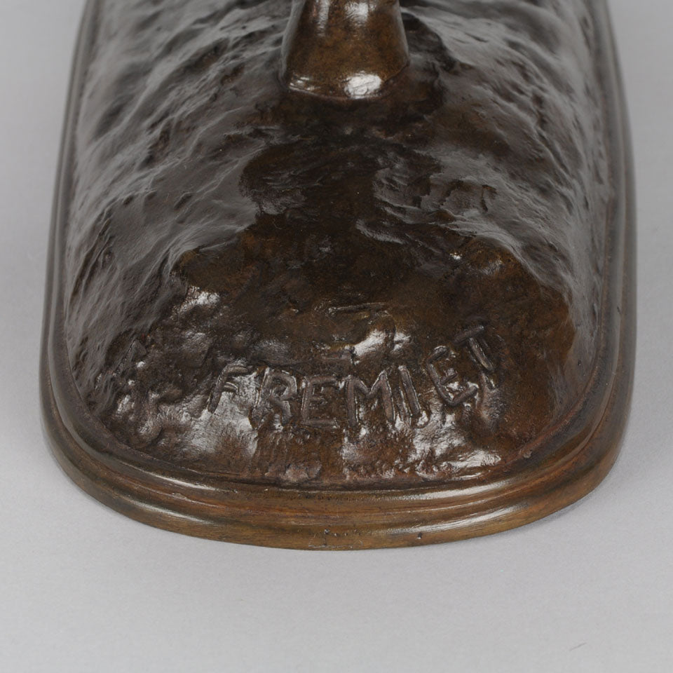 Emmanuel Frémiet (French, 1824 ~ 1910) Frémiet was born in Paris, he was a nephew and pupil of Sophie Frémiet, and later he became a pupil of her husband François Rude. He chiefly devoted himself to animal sculpture. His earliest work was in scientific lithography (osteology), and for a while he served in times of adversity in the gruesome office of painter to the Morgue. In 1843 he sent to the Salon a study of a Gazelle, and after that date worked prolifically. His “Wounded Bear” and “Wounded Dog” were produced in 1850, and the Luxembourg Museum at once secured this striking example of his work.n the 1850s, Frémiet produced various Napoleonic works. He first exhibited in the Paris Salon at the age of nineteen with a sculpture of an Algerian gazelle. In 1853, Frémiet, “the leading sculptor of animals in his day” exhibited bronze sculptures of Emperor Napoleon III’s basset hounds at the Paris Salon. Soon afterwards, from 1855 to 1859 Frémiet was engaged on a series of military statuettes for Napoleon III, none of which have survived. He produced his equestrian statue of Napoleon I in 1868, and of Louis d’Orleans of 1869 (at the Château de Pierrefonds) and in 1874 the first equestrian statue of Joan of Arc, erected in the Place des Pyramides, Paris; this he afterwards (1889) replaced with another version. During this period he also executed “Pan and the bear cubs”, also acquired by the Luxembourg Museum and now in the Musée d’Orsay. He became a member of the Academy Francais in 1892 and an honorary member of the Royal Academy in 1904.