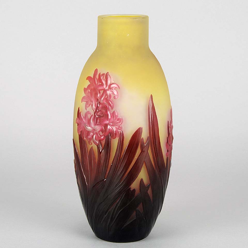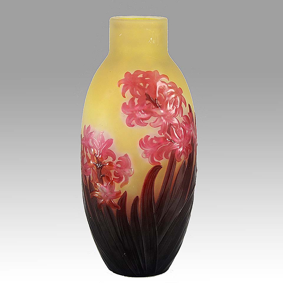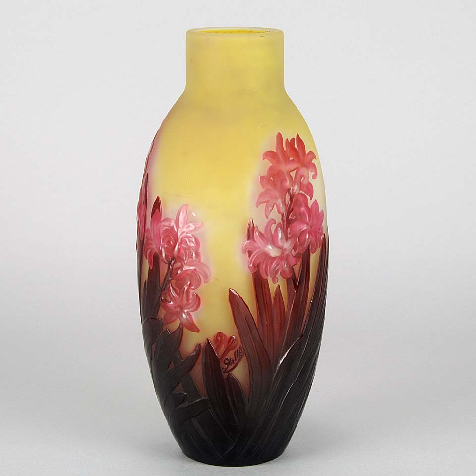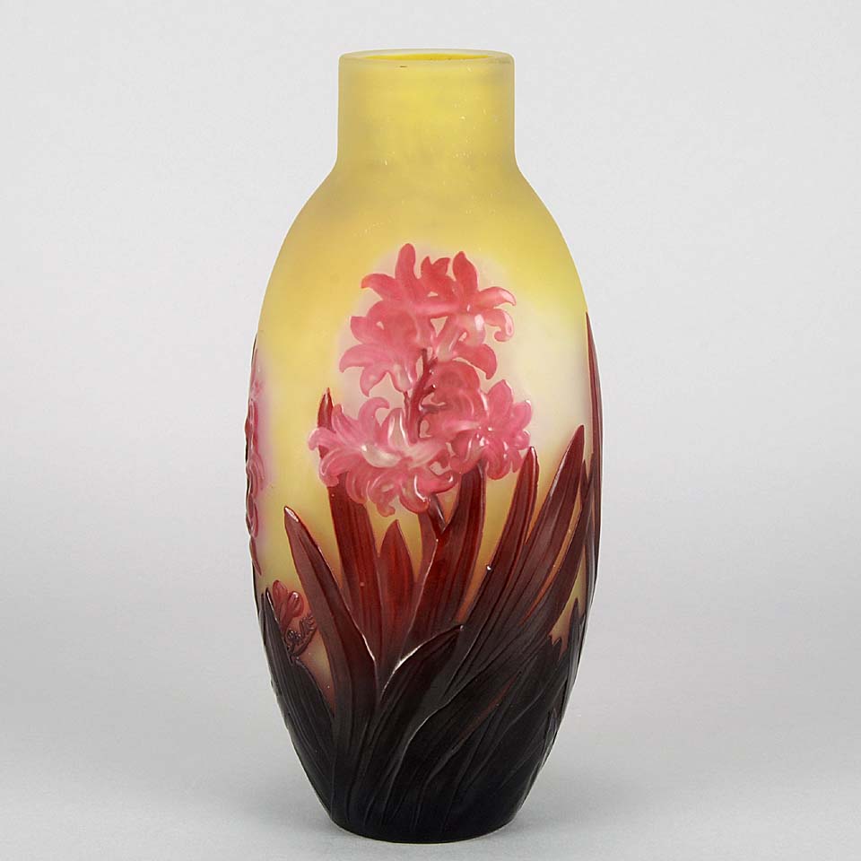 After being inspired by the glass works at the 1878 International Exhibition in Paris, particularly cameo works, Gallé made his mark as a true artist in glass at the 1884 Union Centrale des Arts Décoratifs in Paris where he showed 300 pieces of great artistic variety as well as technical expertise. He returned to the International Exhibition in Paris in 1889 to present his own new types of glass. The pieces featured new vase shapes, extraordinary new colours, carved cameo and pate de verre work. The event was a breakthrough for him and the Art Nouveau style in general, with his pieces beginning to be widely imitated (notably by the likes of the Daum brothers.)