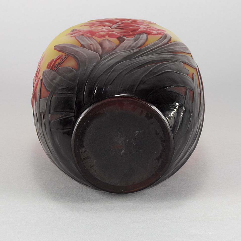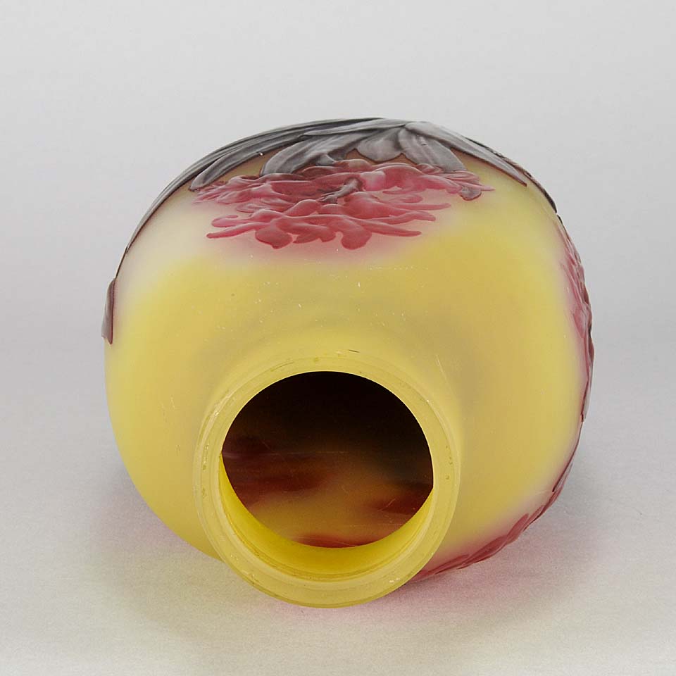 An excellent early 20th Century mould blown soufflé cameo glass vase decorated with vibrant red Chrysanthemum flowers against a warm yellow field, exhibiting excellent colour and detail, signed Gallé.