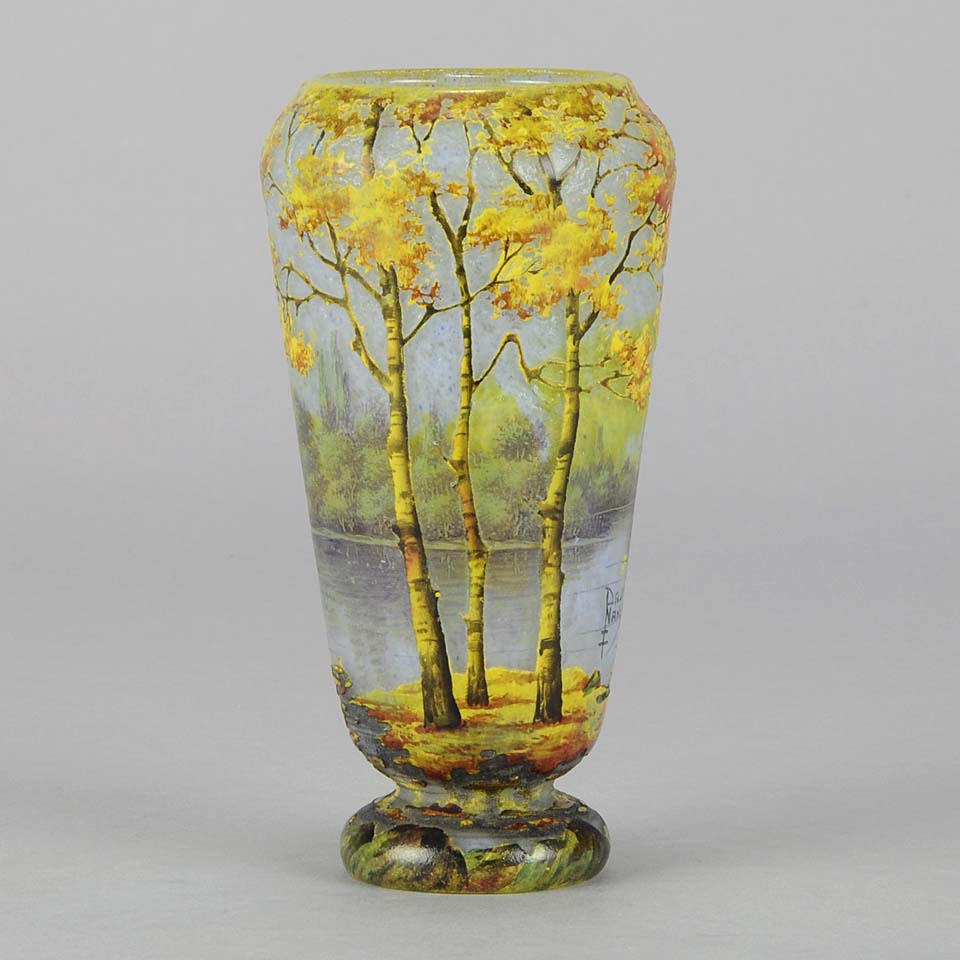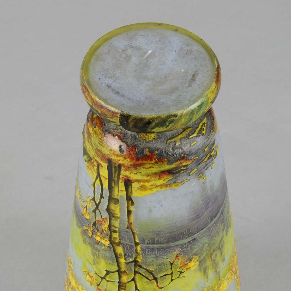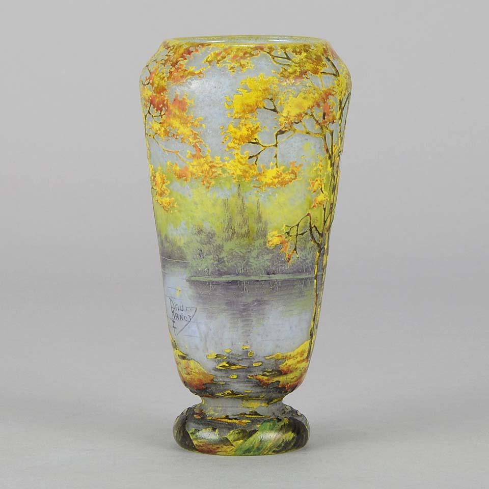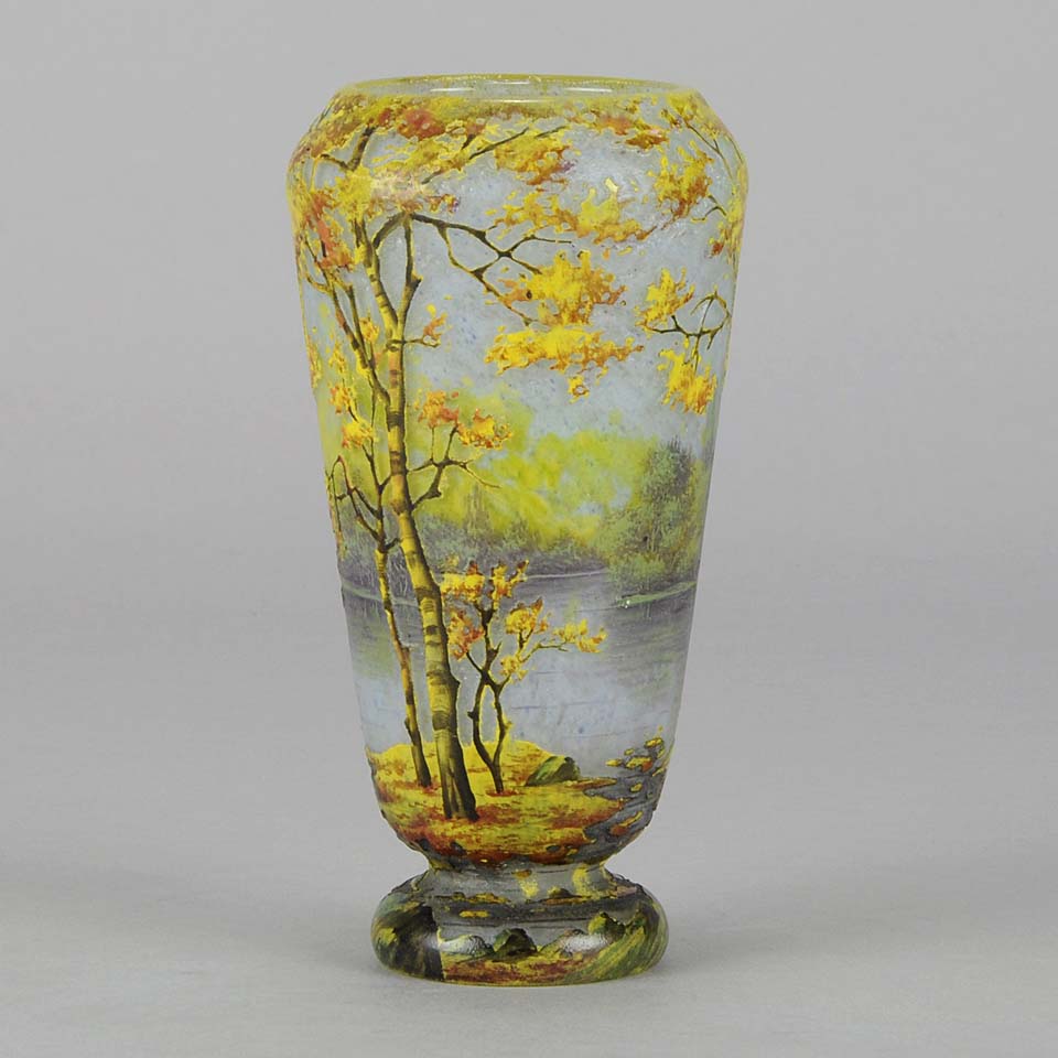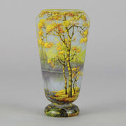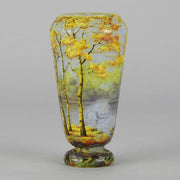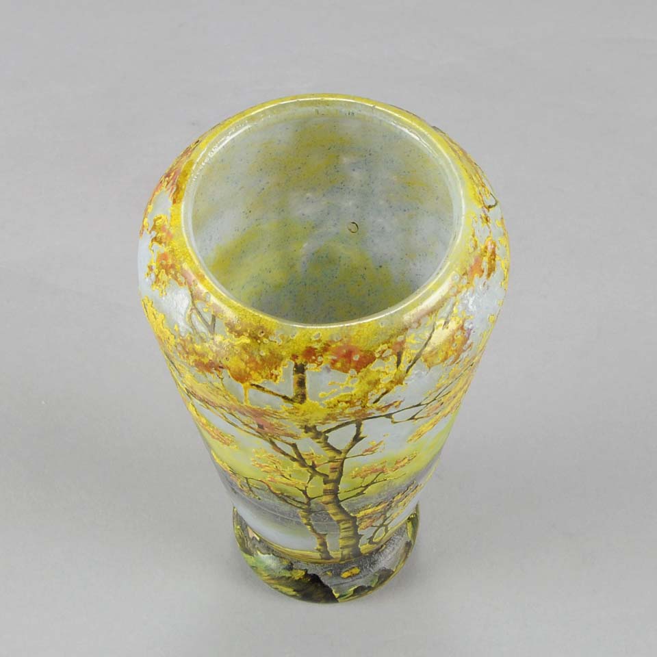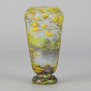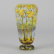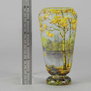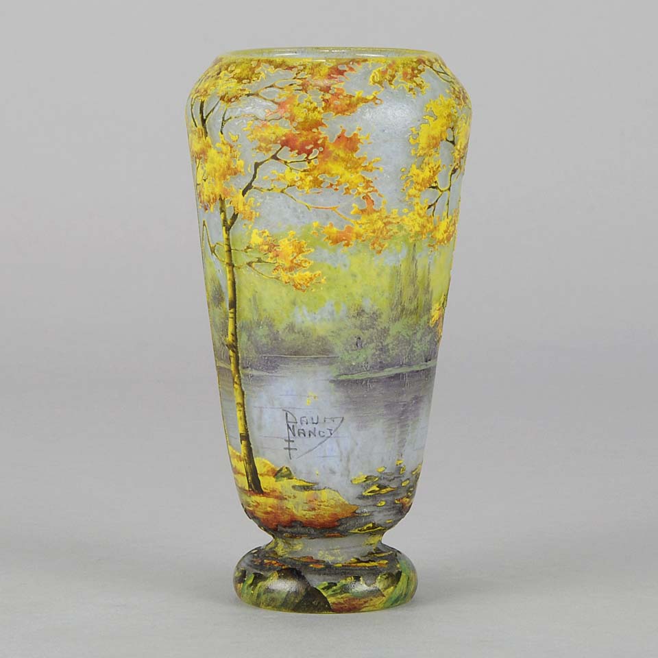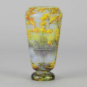 A quite stunning cameo glass vase etched and enamelled with a deep autumnal scene represented by trees with yellow, orange and brown leaves situated beside a landscape with a lake and further trees in the distance. Signed Daum Nancy and with the Cross of Lorraine