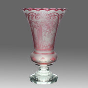 A dramatic and impressive cameo glass vase cased in deep pink/red overlay, cut and engraved with an Art Nouveau, Alphonse Mucha inspired beautiful lady with decorated accents and borders around the full circumference of the body, raised on clear circular foot panel cut in spreading segments