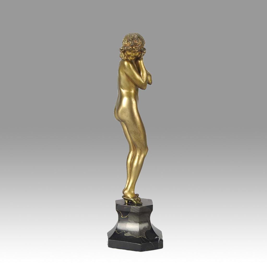 An excellent Art Deco cold painted bronze study of a young beauty, standing naked except for her heeled slippers, in a coy pose covering her modesty with her crossed arms. The bronze with fine deep golden colour and good hand finished detail, raised on a panel cut portoro marble base and signed Cl.J.R.Colinet