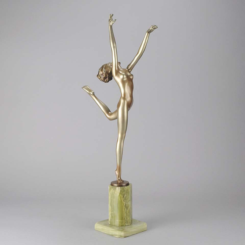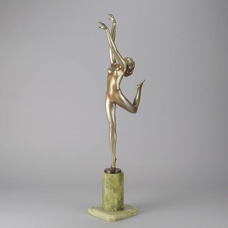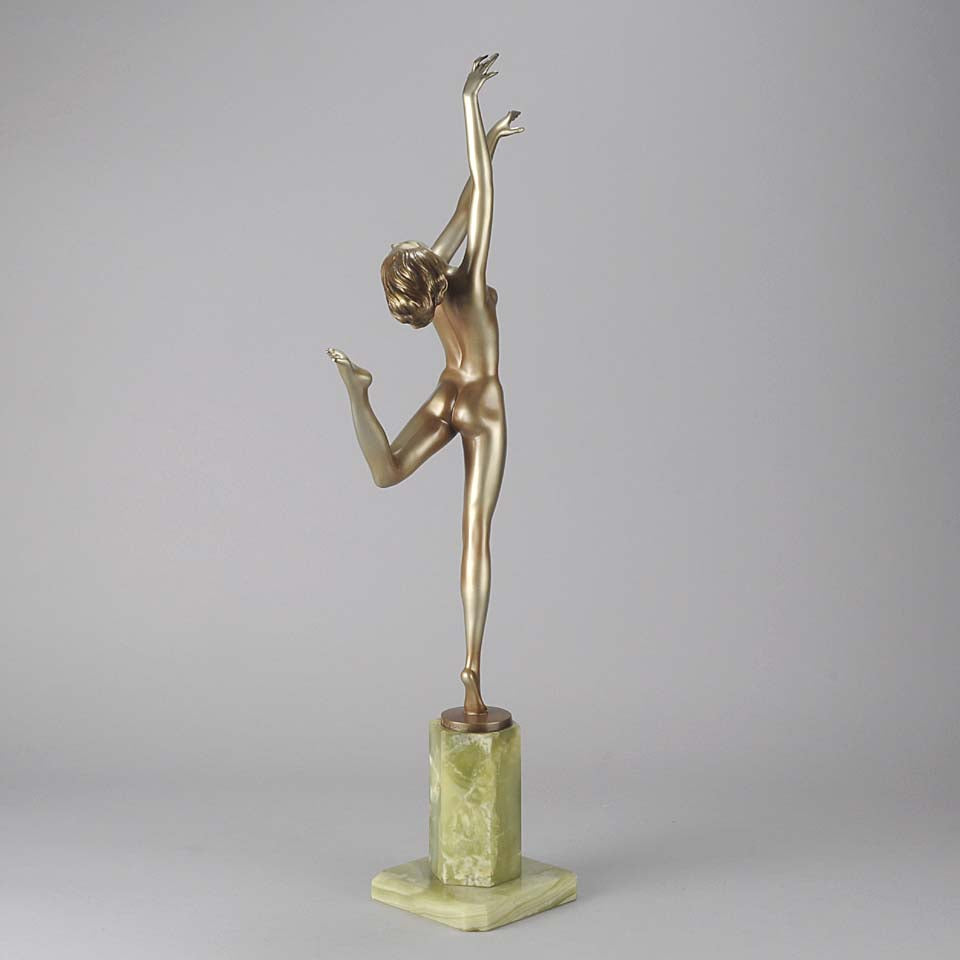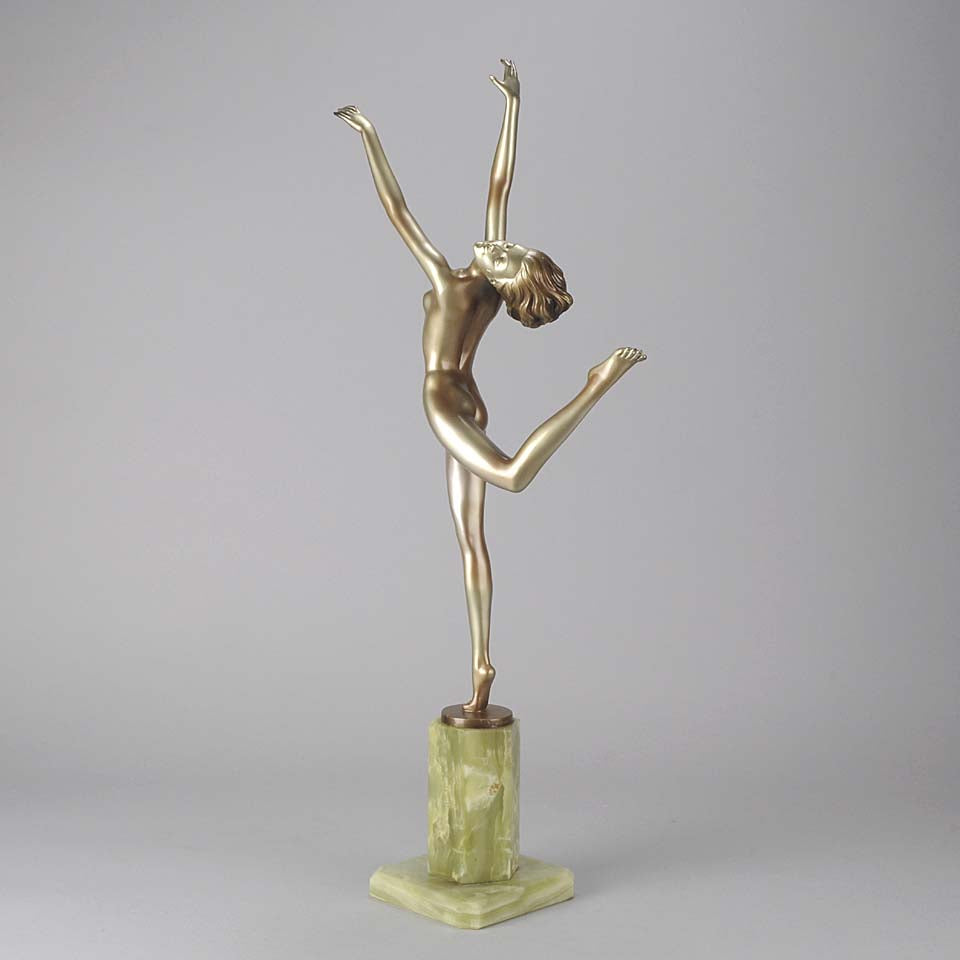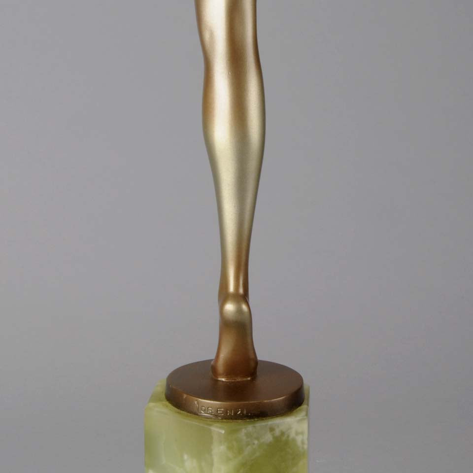 Impressive cold painted bronze figure of an Art Deco dancer holding a stretched pose with excellent colour and good detail, raised on an onyx base and signed Lorenzl