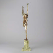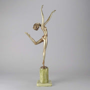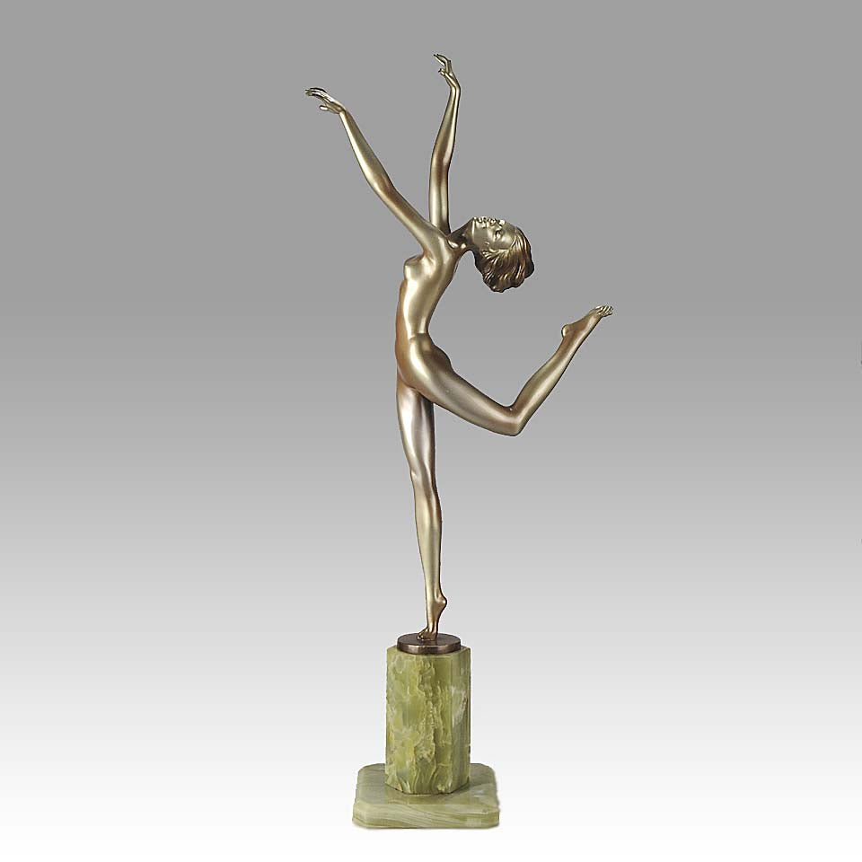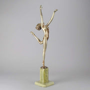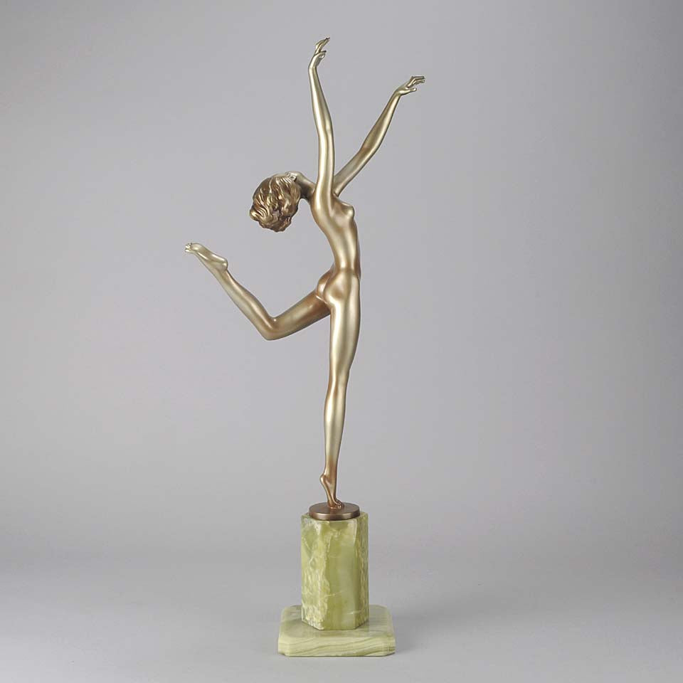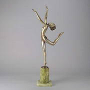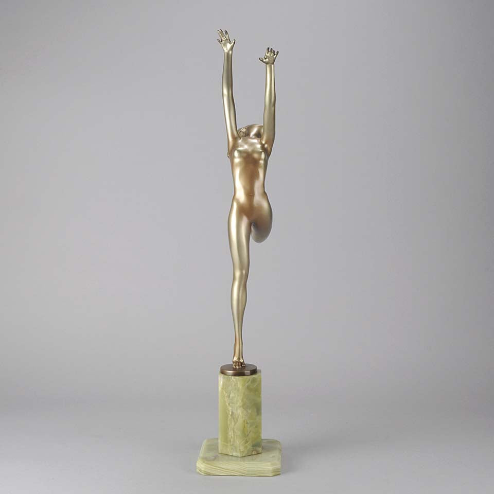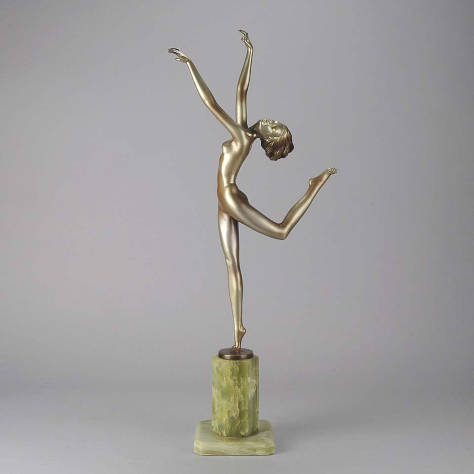 Impressive cold painted bronze figure of an Art Deco dancer holding a stretched pose with excellent colour and good detail, raised on an onyx base and signed Lorenzl
