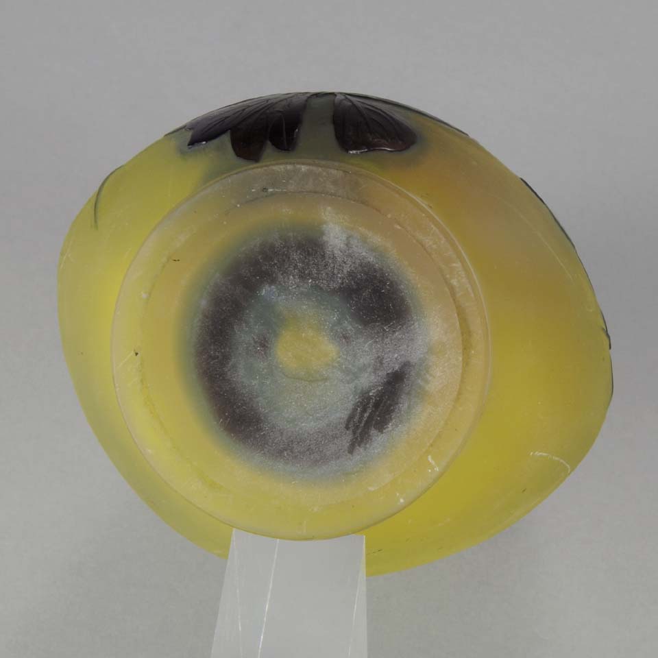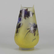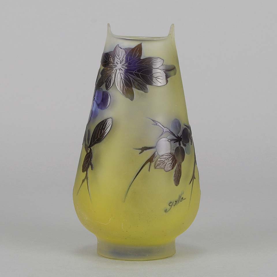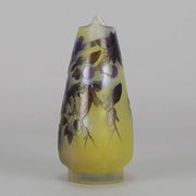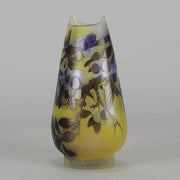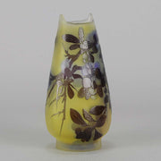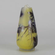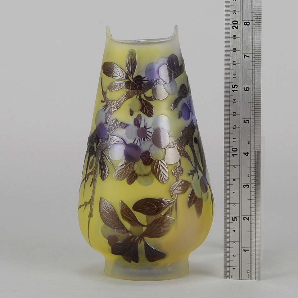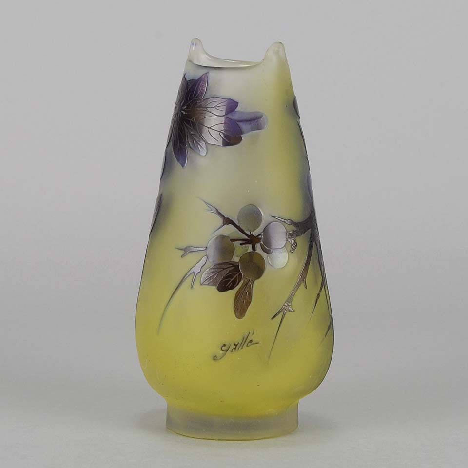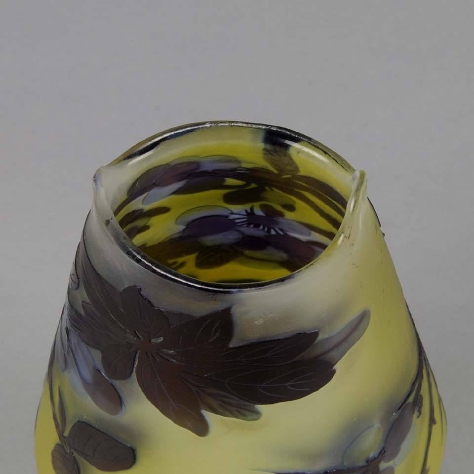A super late 19th Century cameo glass vase acid etched with a blue and purple floral decoration against a warm yellow field with excellent colour and very fine hand finished detail, signed Gallé