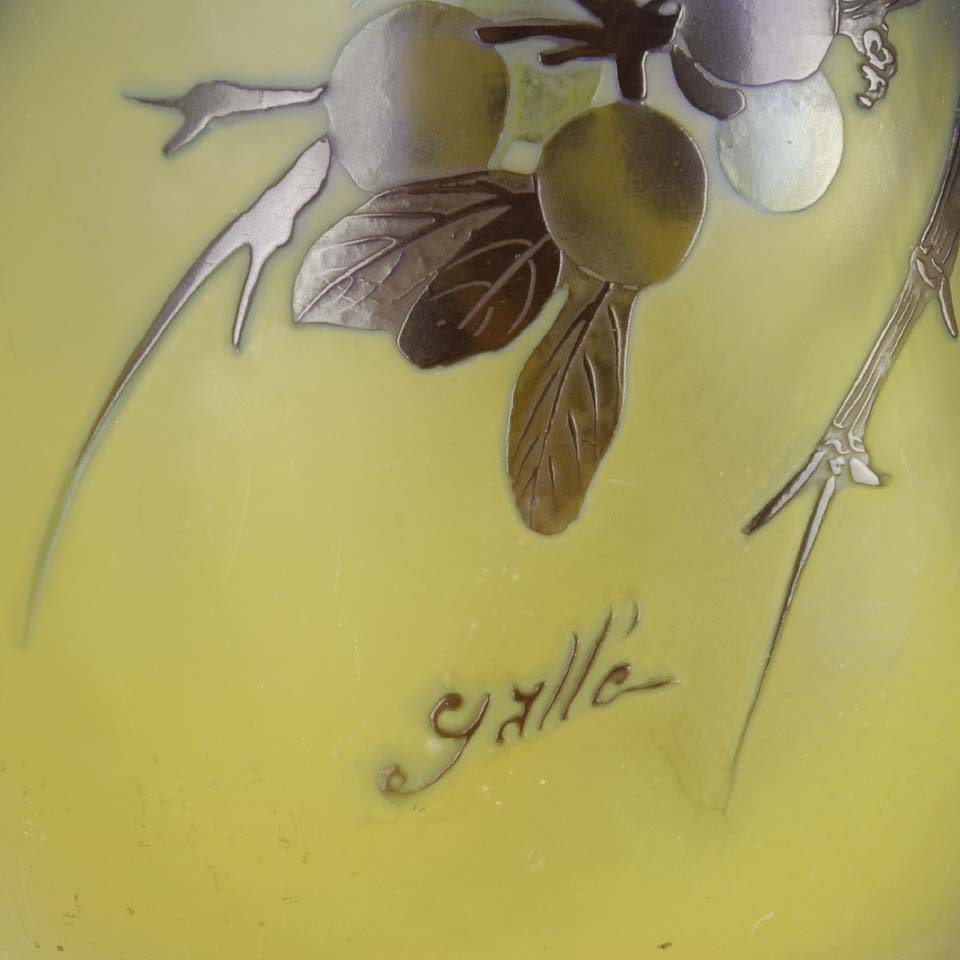 His work normally signed Gallé in relief. Works made by his factory after his death, in 1904, are marked with a star after his signature.