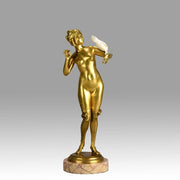 A fabulous Art Deco gilt bronze figure of a young beauty dressed only in high heeled shoes and stockings, balancing a carved ivory parrot on her left shoulder, the surface of the bronze with excellent colour and very fine hand finished detail, raised on a marble base and signed H Keck and K Braun for the Berlin Foundry