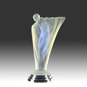 An exquisite early 20th Century opalescent glass figure entitled ‘Nue au Bras Tendu’. This striking Art Deco glass figure of a lady holding an animated pose as her shawl drapes across her shoulders, exhibiting excellent colour and very fine detail produced by the Etlingglassworks and designed by in-house artist LucilleSevin. Signed Etling and raised on original chrome plated metal stepped desk stand.