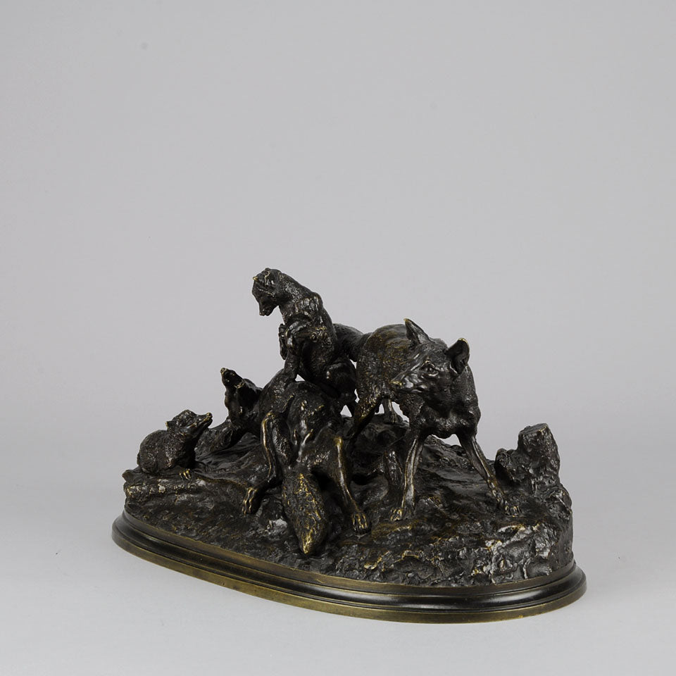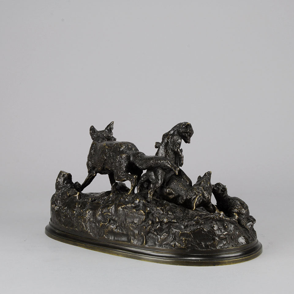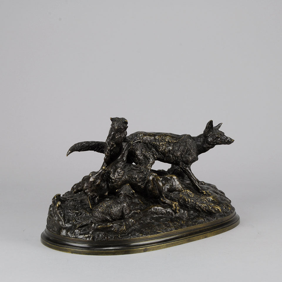 Exquisite and very rare mid 19th Century French Animalier Bronze study of a family of foxes at play, their caring father ever watchful and vigilant. This bronze captures a playfulness that warms the heart, with fabulous hand chased surface detail and rich brown patina. A large and rare bronze that is signed P.J.Mene and Dated 1847.