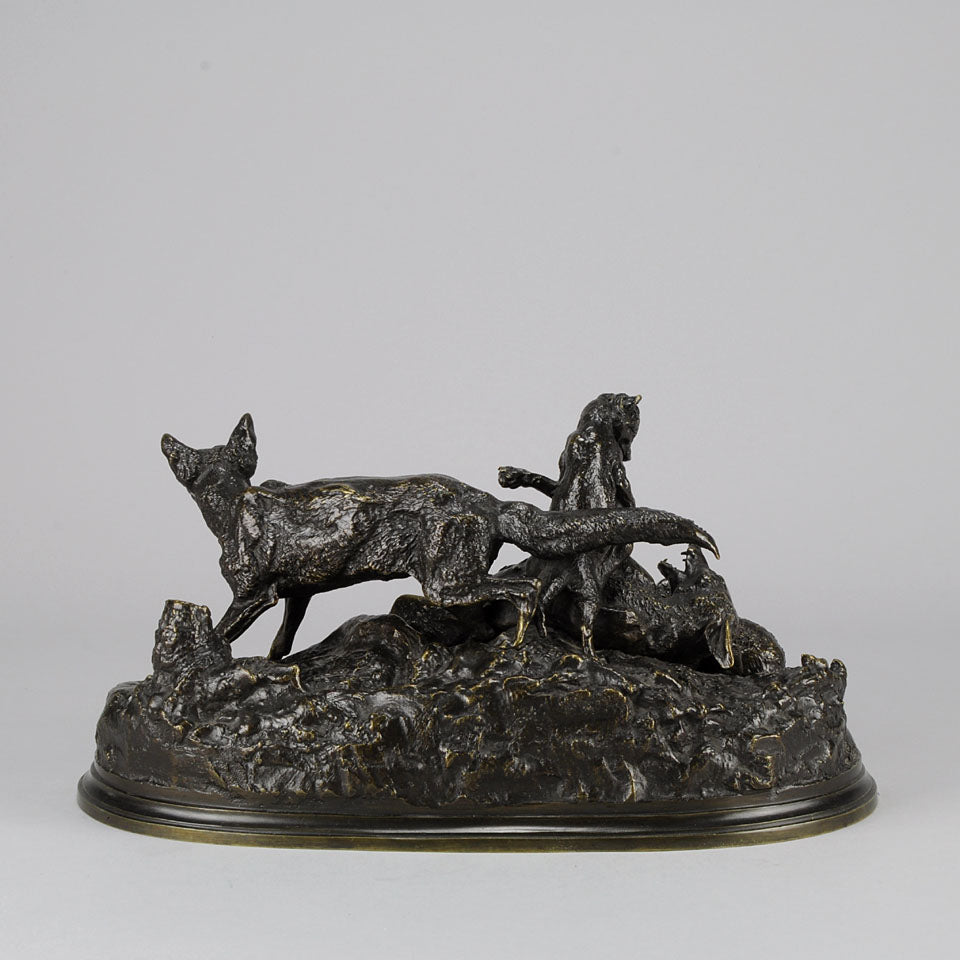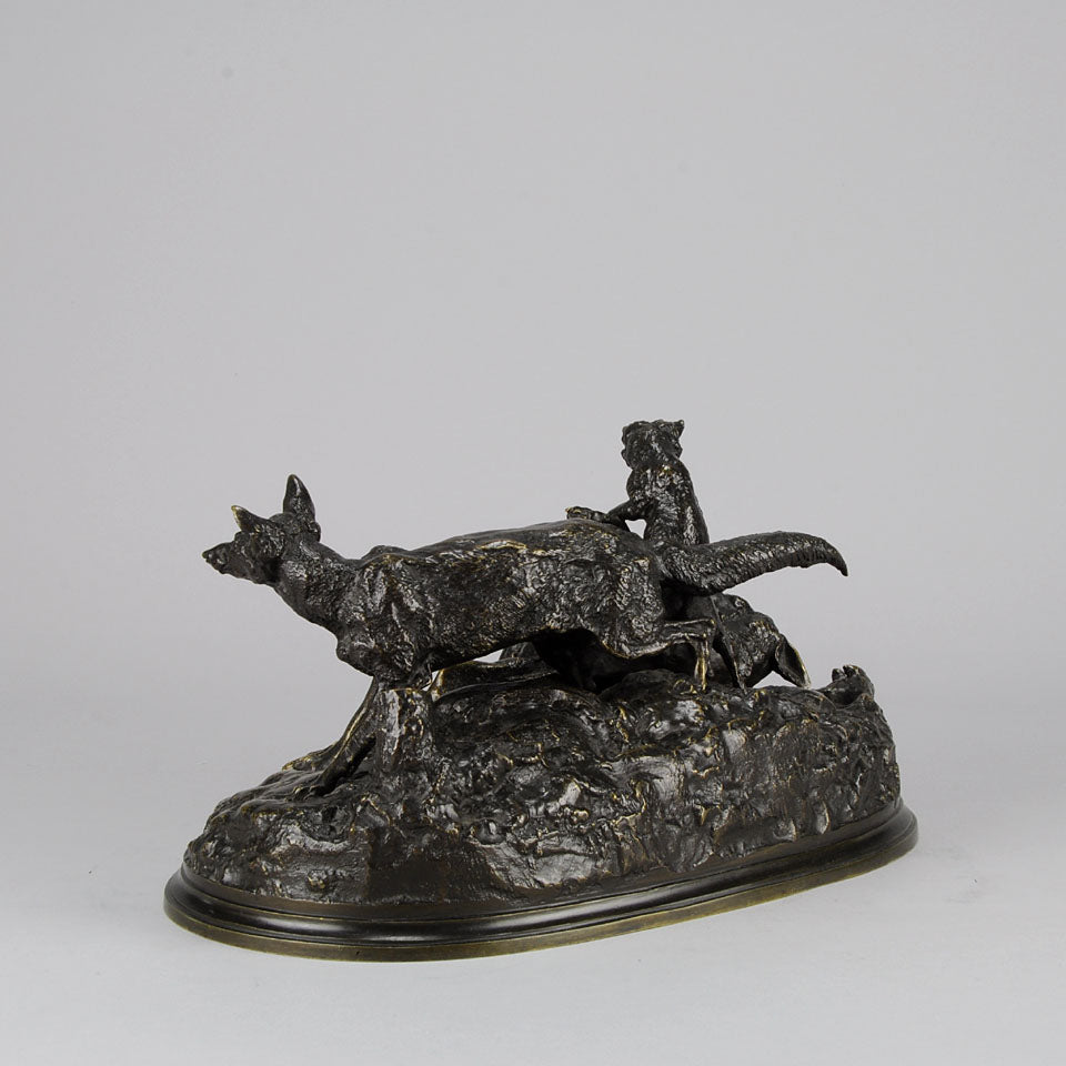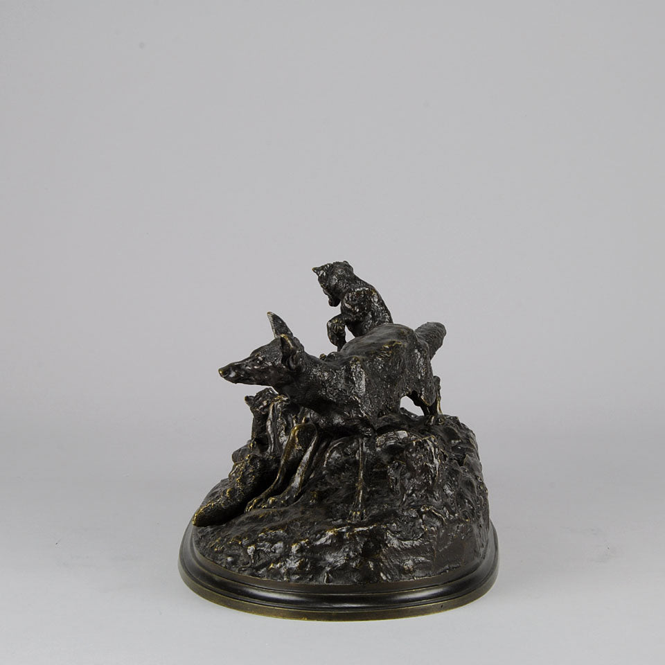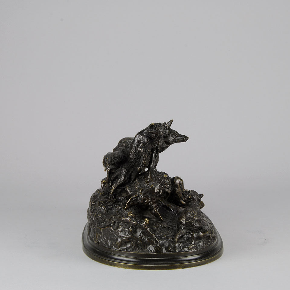 Exquisite and very rare mid 19th Century French Animalier Bronze study of a family of foxes at play, their caring father ever watchful and vigilant. This bronze captures a playfulness that warms the heart, with fabulous hand chased surface detail and rich brown patina. A large and rare bronze that is signed P.J.Mene and Dated 1847.
