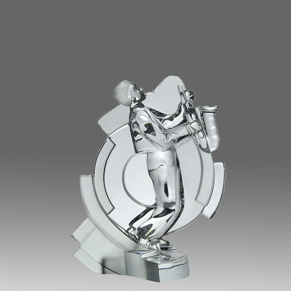A very fine mid 20th Century clear and frosted glass figurative study trophy in the form of a jazz musician playing a saxophone with excellent crisp hand cut detail, signed and with original sticker.