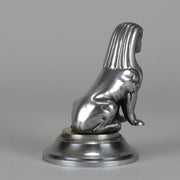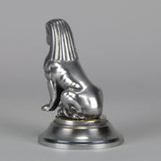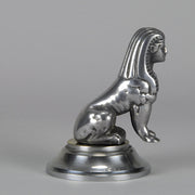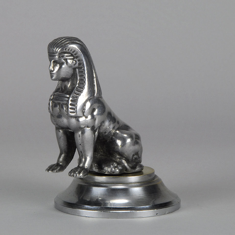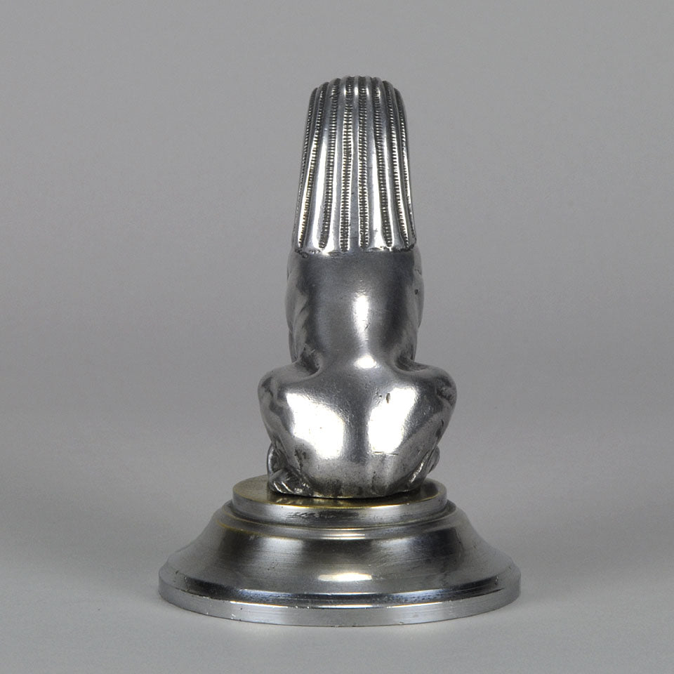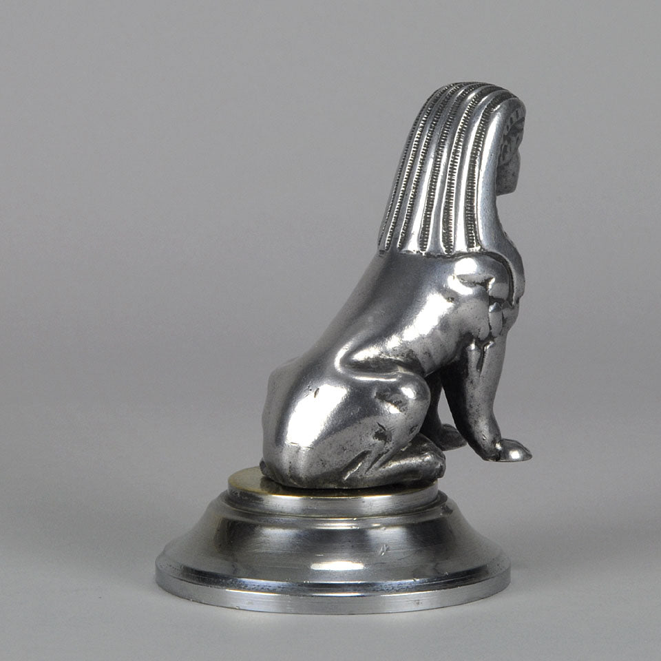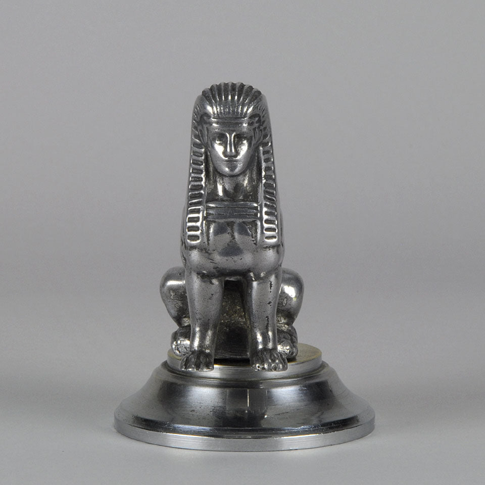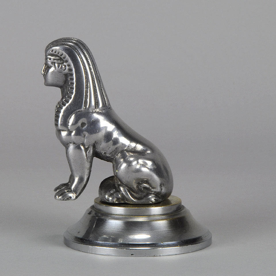 An eye catching nickel plated Art Deco Sphinx Car Mascot, this impressive figure encompasses the age of glamour and lavish adornments in the ‘Age of Speed’. Exhibiting a well polished surface and fine hand finished detail it is raised and fitted on a stepped circular stand.
