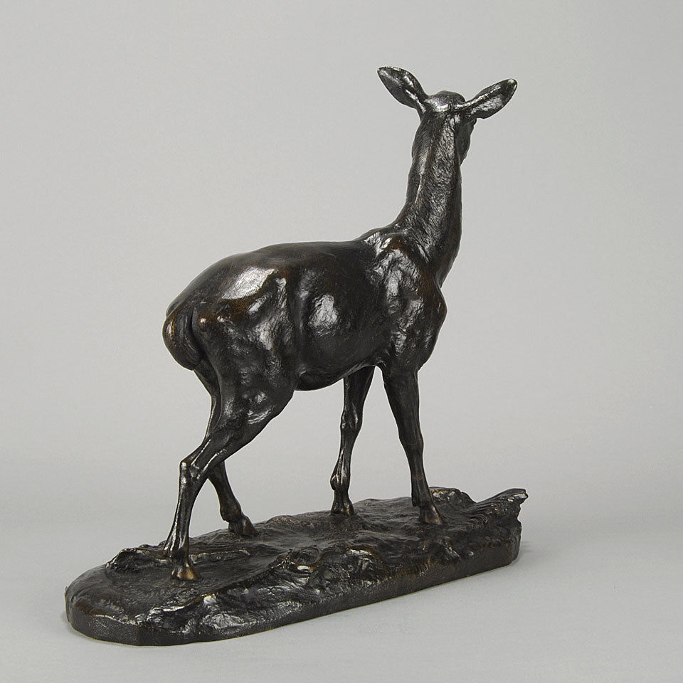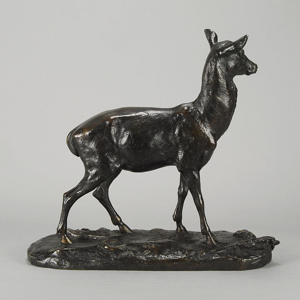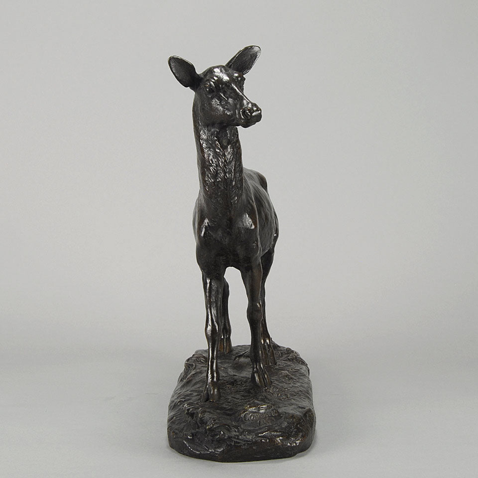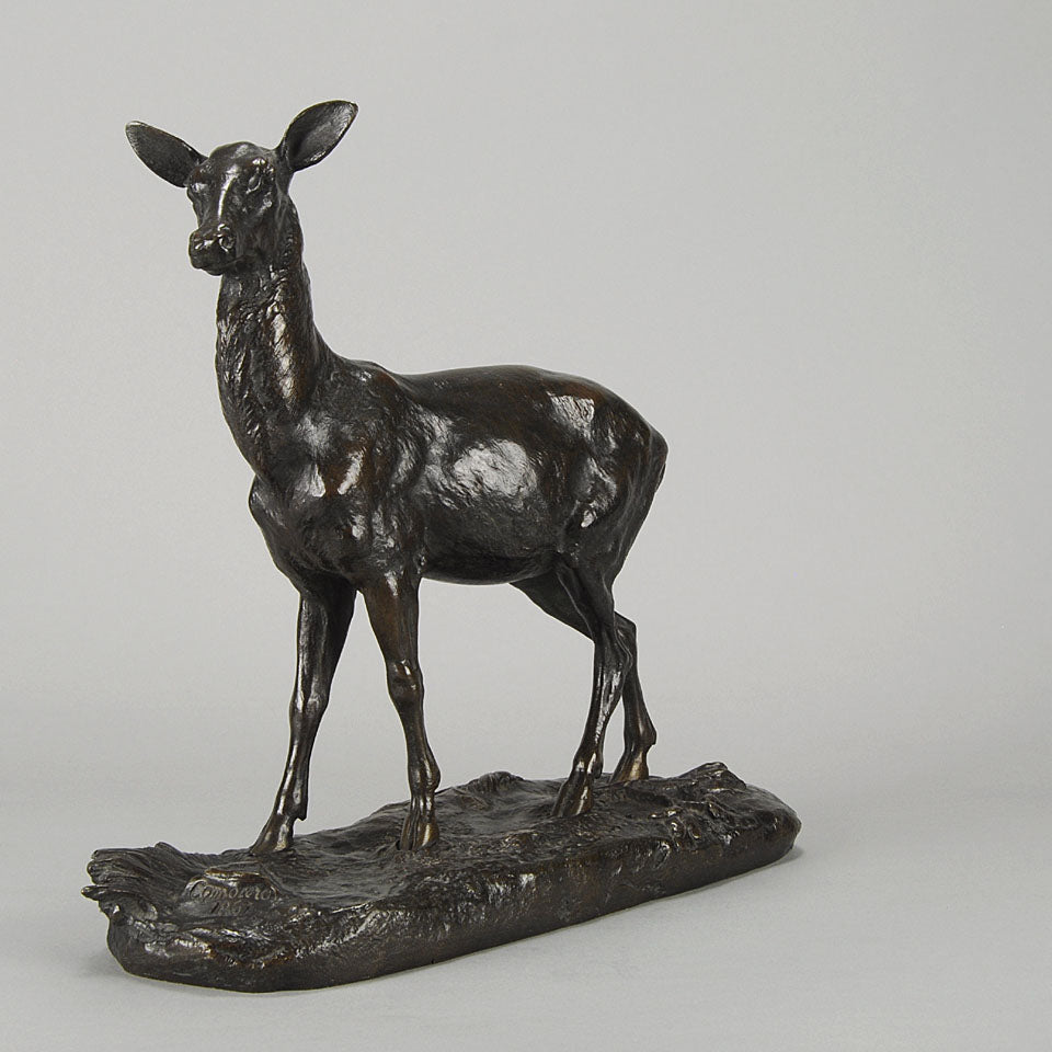 Very fine French animalier bronze study of a standing doe with good rich brown patination and fine hand chased surface detail. Raised on a naturalistic base, signed Comolera and dated 1867