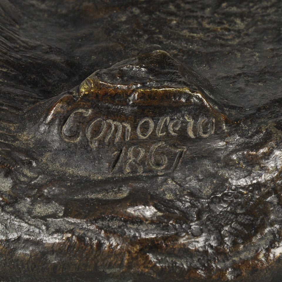 Paul Comolera (French, 1818 ~ 1897) Comolera was born in Paris, France. A very fine sculptor known mainly for his modelling of birds but he also produced some other animal figures as well as portrait busts. Comolera was a student of the early sculptor Francois Rude and he was the teacher of Jules Moigniez, one of the more important sculptors of the Animalier school. There is a distinct similarity in the detail, construction, form, and finish of the works of Comolera and his student Moigniez although Comolera’s birds are considered to be more in the naturalistic style as opposed to the romantic style of his pupil. Paul Comolera made his debut at the Salon in 1846 with a group called Golden Pheasants of China and continued to exhibit there until his death in 1897. Comolera’s bronzes are prized for their great detail and accuracy.