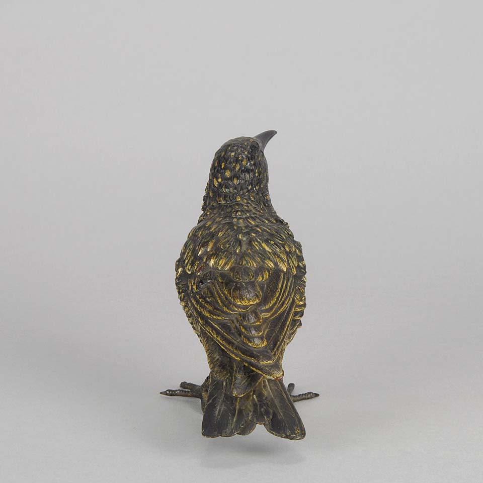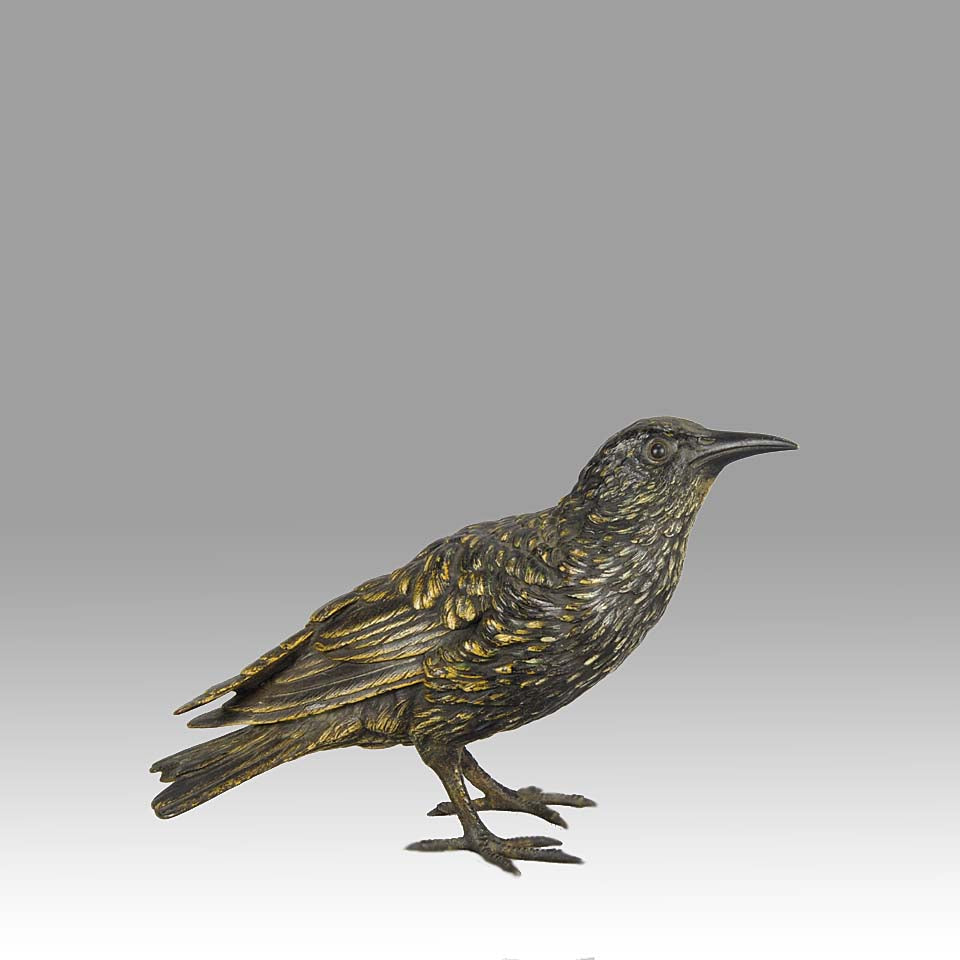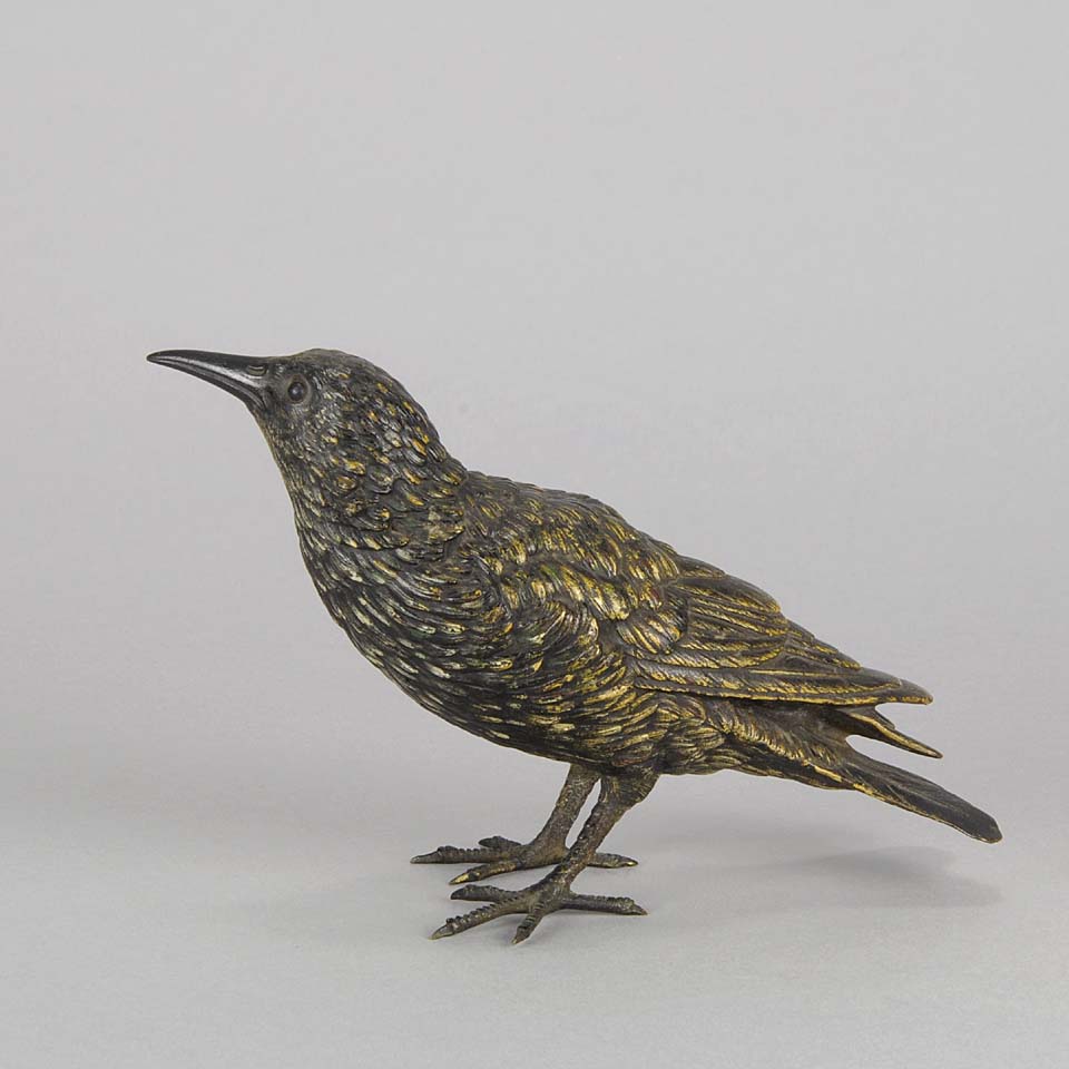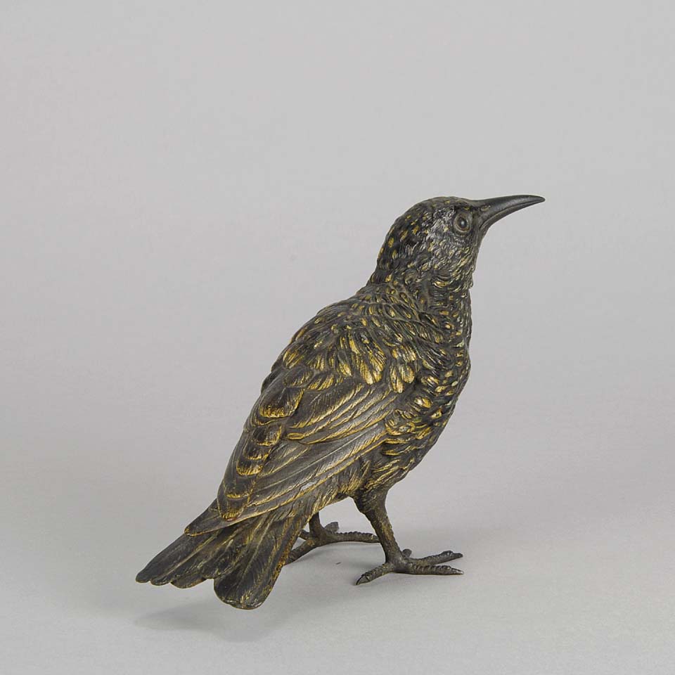 A very fine early 20th Century cold painted Austrian bronze study of a  standing starling with excellent hand chased surface detail and fine naturalistic colour, signed with the Bergman ‘B’ in an amphora vase