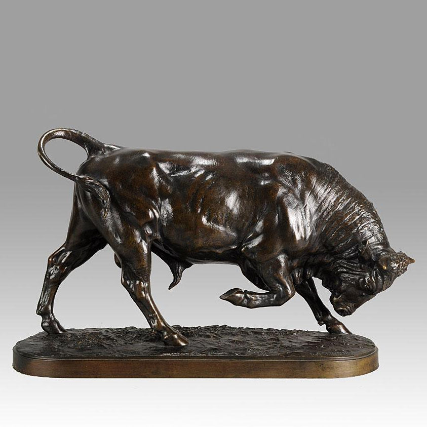 A large and impressive mid 19th Century Animaliers bronze study of a charging bull with excellent hand chased surface detail and rich brown patina. Raised on an integral naturalistic bronze base, signed I Bonheur and stamped Peyrol.