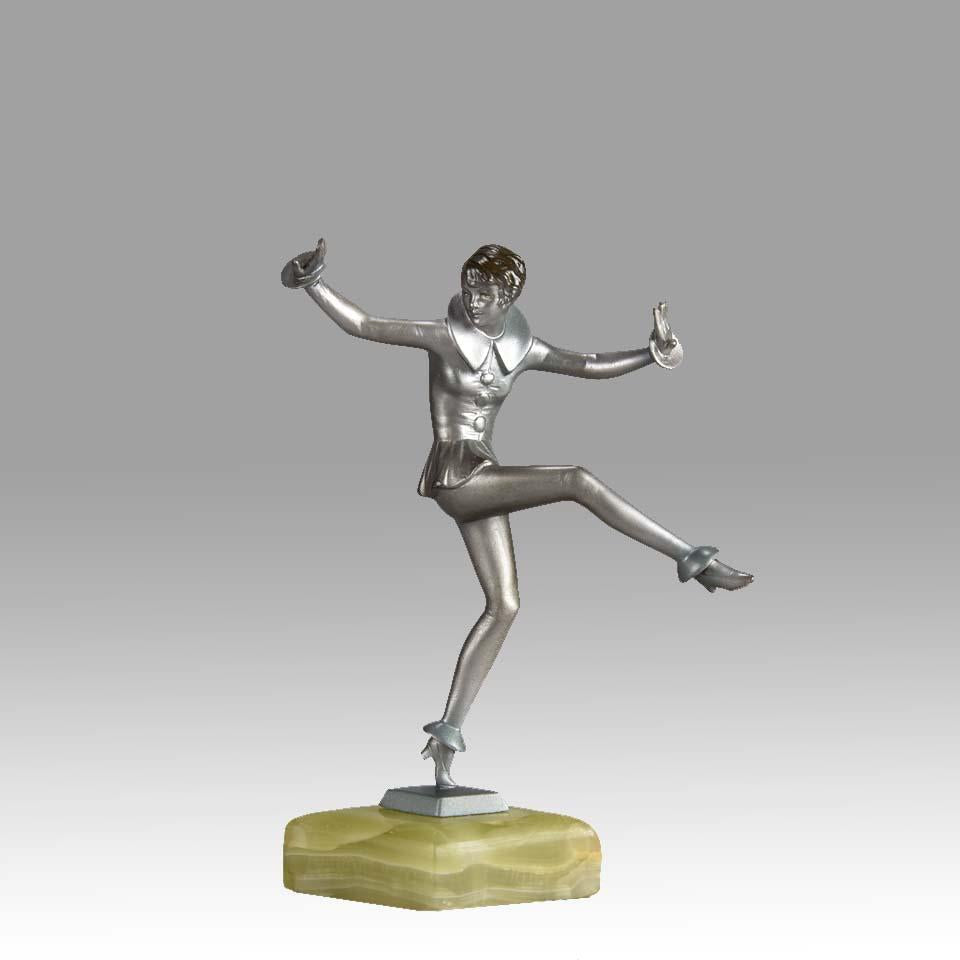 A very fine early 20th Century Austrian Art Deco cold painted bronze figure by Josef Lorenzl of a beautiful young lady in an energetic pose dressed in a trouser suit, with excellent colour and detail, raised on an onyx base, signed Lorenzl.
