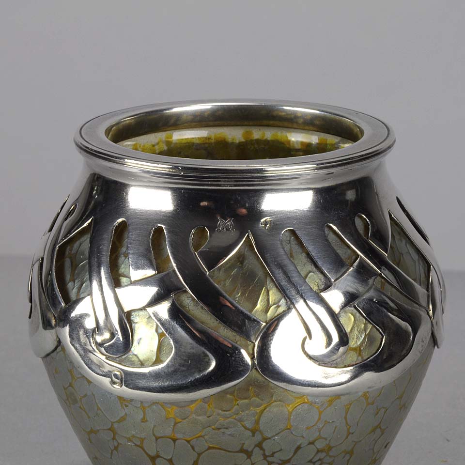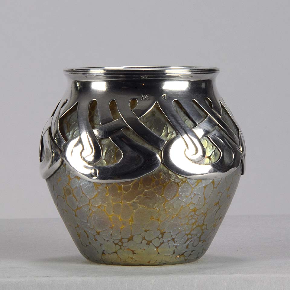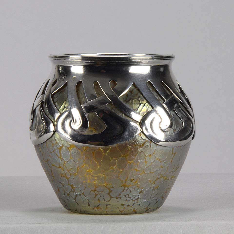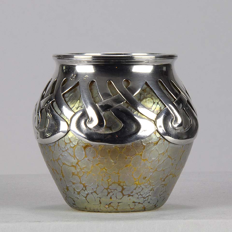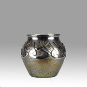 An excellent and very rare early 20th Century iridescent glass vase of bulbous form heightened with an applied silver Art Nouveau design, stamped. For full details please see additional information below