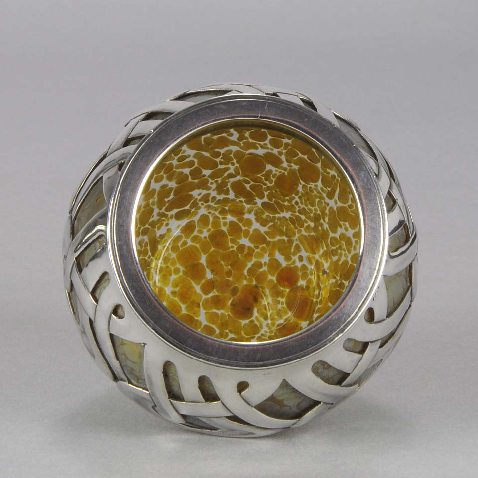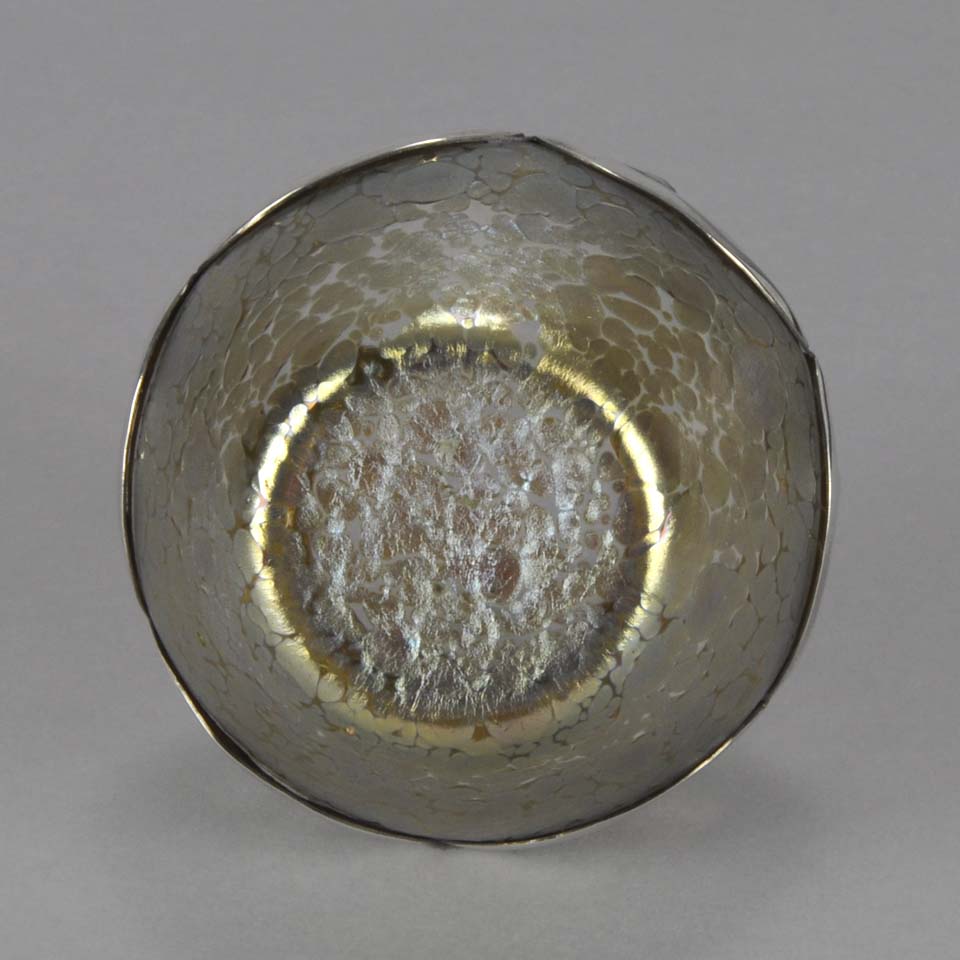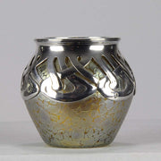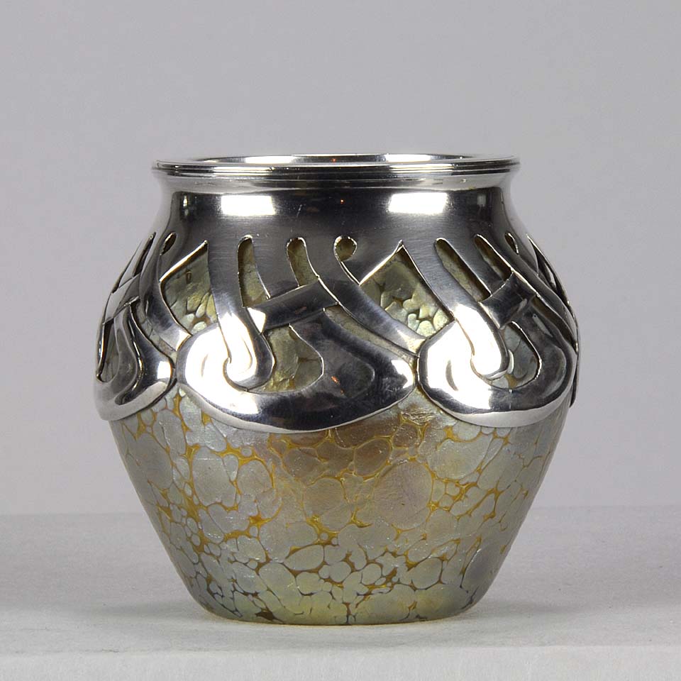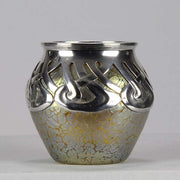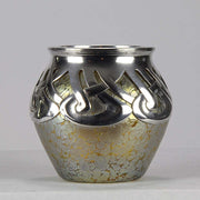 An excellent and very rare early 20th Century iridescent glass vase of bulbous form heightened with an applied silver Art Nouveau design, stamped. For full details please see additional information below