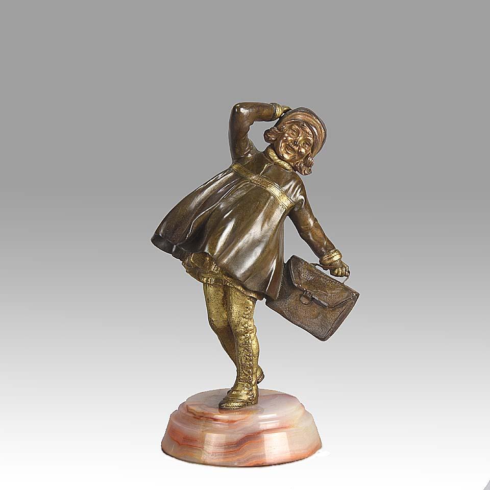 A charming early 20th Century cold painted Art Deco bronze figure of a young school girl carrying her satchel whilst holding her hat to her head so it doesn’t blow away in the wind with very fine detail, raised on shaped cream onyx plinth, signed Chiparus