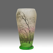 A wonderful cameo glass vase, finely etched and enamelled with trees in a winter woodland landscape, encircled by delicately etched rain motifs. The glass transitions with gentle movement from green at the base, through soft pink where land meets sky, and into cool grey tones above, creating depth and atmospheric nuance. Signed Daum Nancy, with the Cross of Lorraine to the underside of the base.