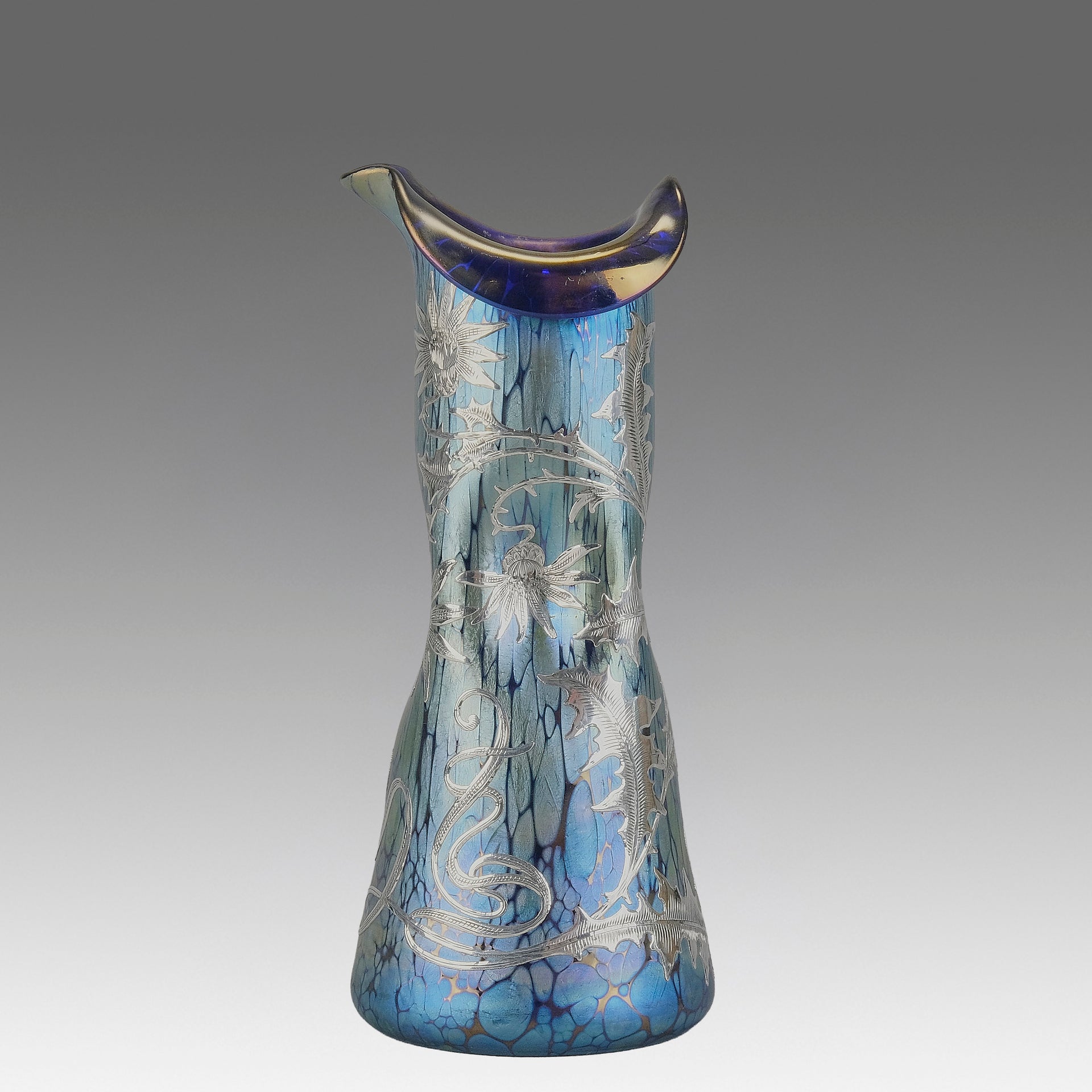 By 1889, Loetz was one of the region’s leading glassmakers. That year, the company took first prize at the Paris Exhibition for its classic vase forms, some of which were hand-worked and deformed into swirling, organic-looking shapes like seashells, flowers, and tree trunks. Decorative vases, cups, and pitchers were other popular forms in the Loetz lexicon, and many of the pieces practically glowed thanks to their iridescent sheen from the firing and reduction techniques that were popular at the time. For its contributions to the field, Loetz was awarded the grand prize at the Paris World Exhibition in 1900.