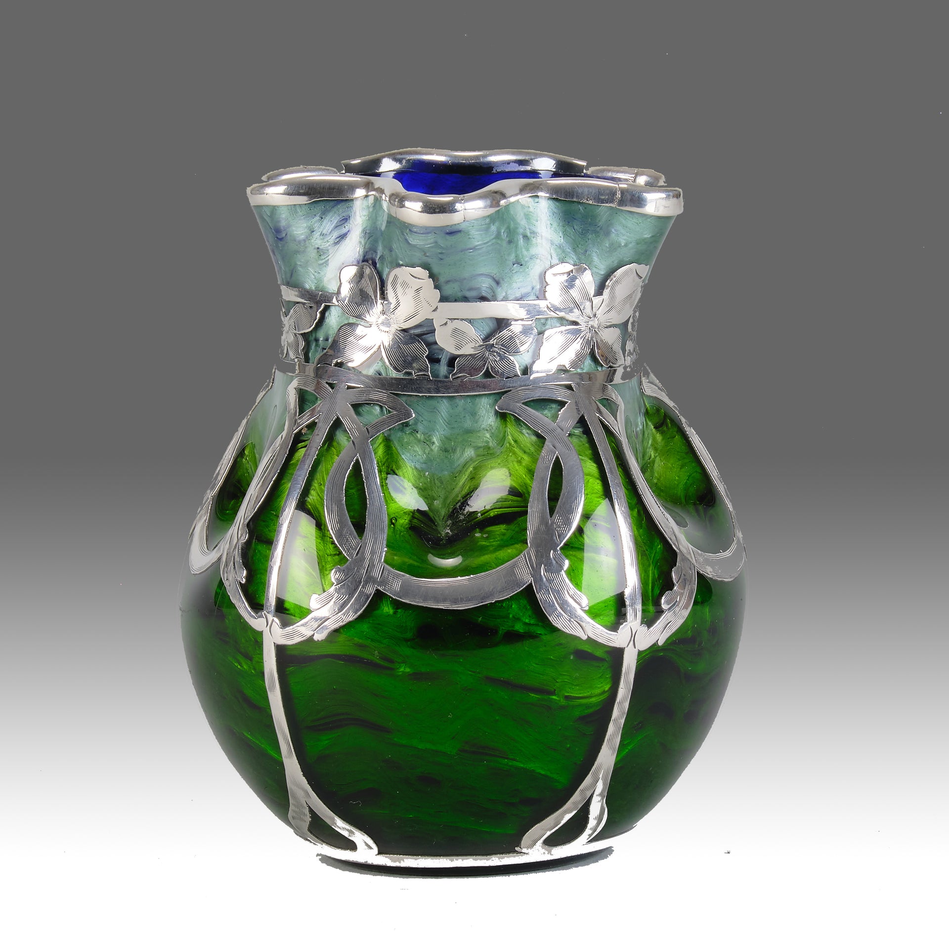 A very beautiful Loetz Witwe glass vase with an attractive swirling pattern of deep blue and green (blau mit grün) colours applied with silver Art Nouveau motifs from the Titania range