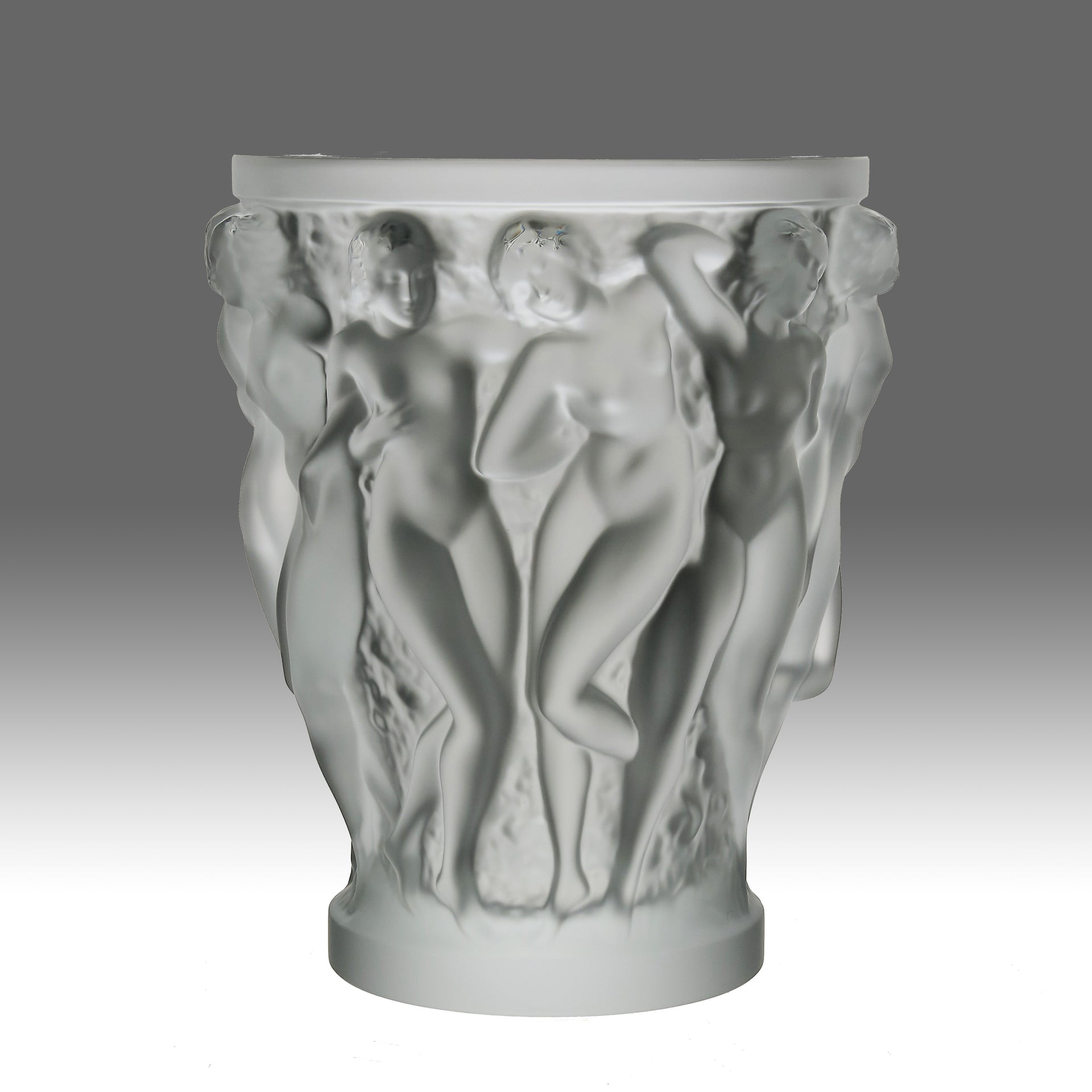 Dramatic frosted and polished glass vase decorated with dancing bacchantes in various poses and pairings. This fabulous vase was produced at the Lalique glassworks and is enhanced with burnished areas and a fabulous detailed finish, signed Lalique France and numbered