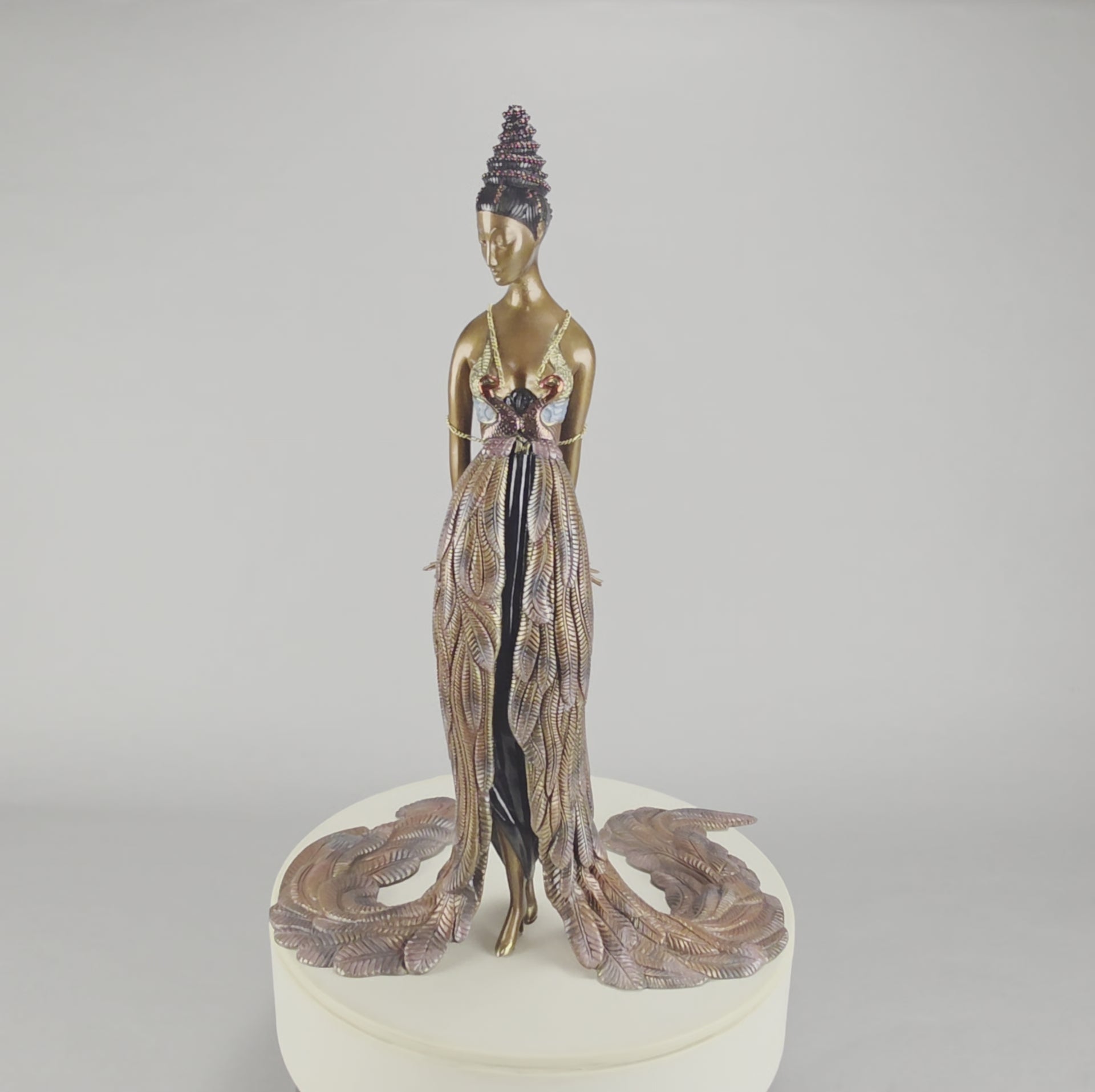 A wonderful limited edition Art Deco bronze sculpture depicting a young woman in a striking colourful floor-length gown, adorned with two stylized birds' heads at the bodice and a flowing feathered base. Signed Erté, dated 1989, and numbered from edition of 375, with the foundry mark of Seven Arts Ltd.