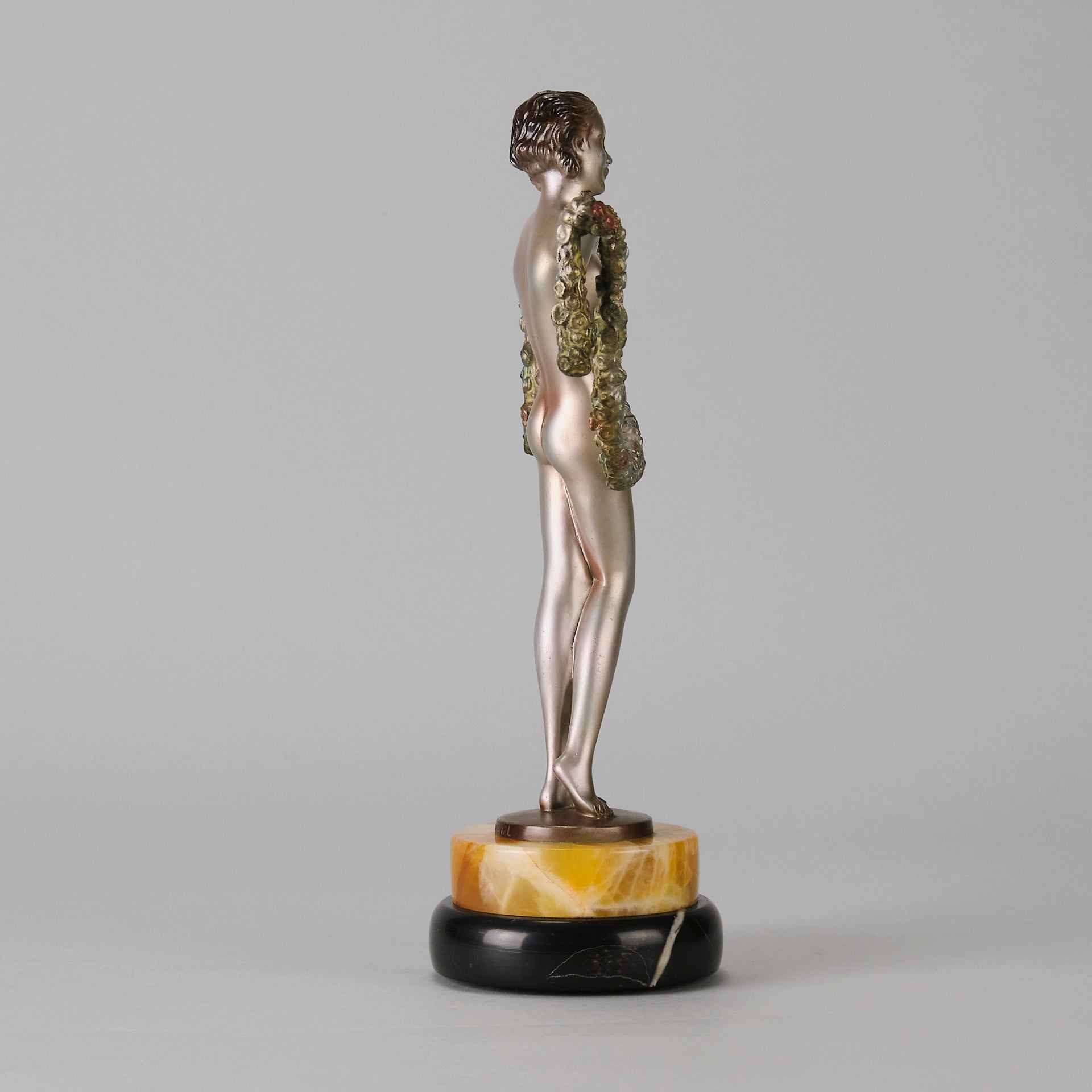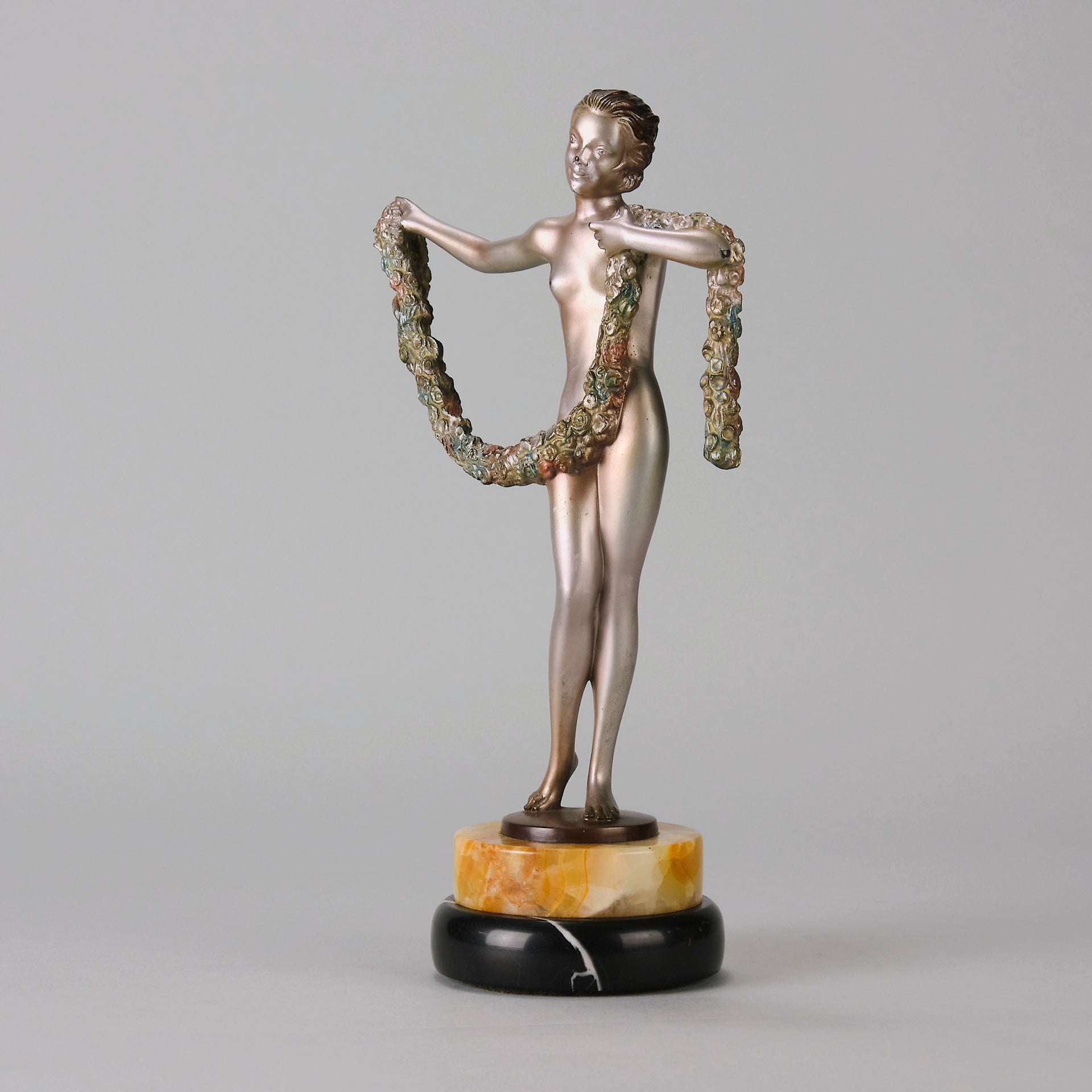 A fabulous early 20th Century Art Deco cold painted silver and enamel bronze figure of a dancer holding a garland of flowers in her arms, raised on a circular stepped onyx and marble base and signed to base rim Lorenzl