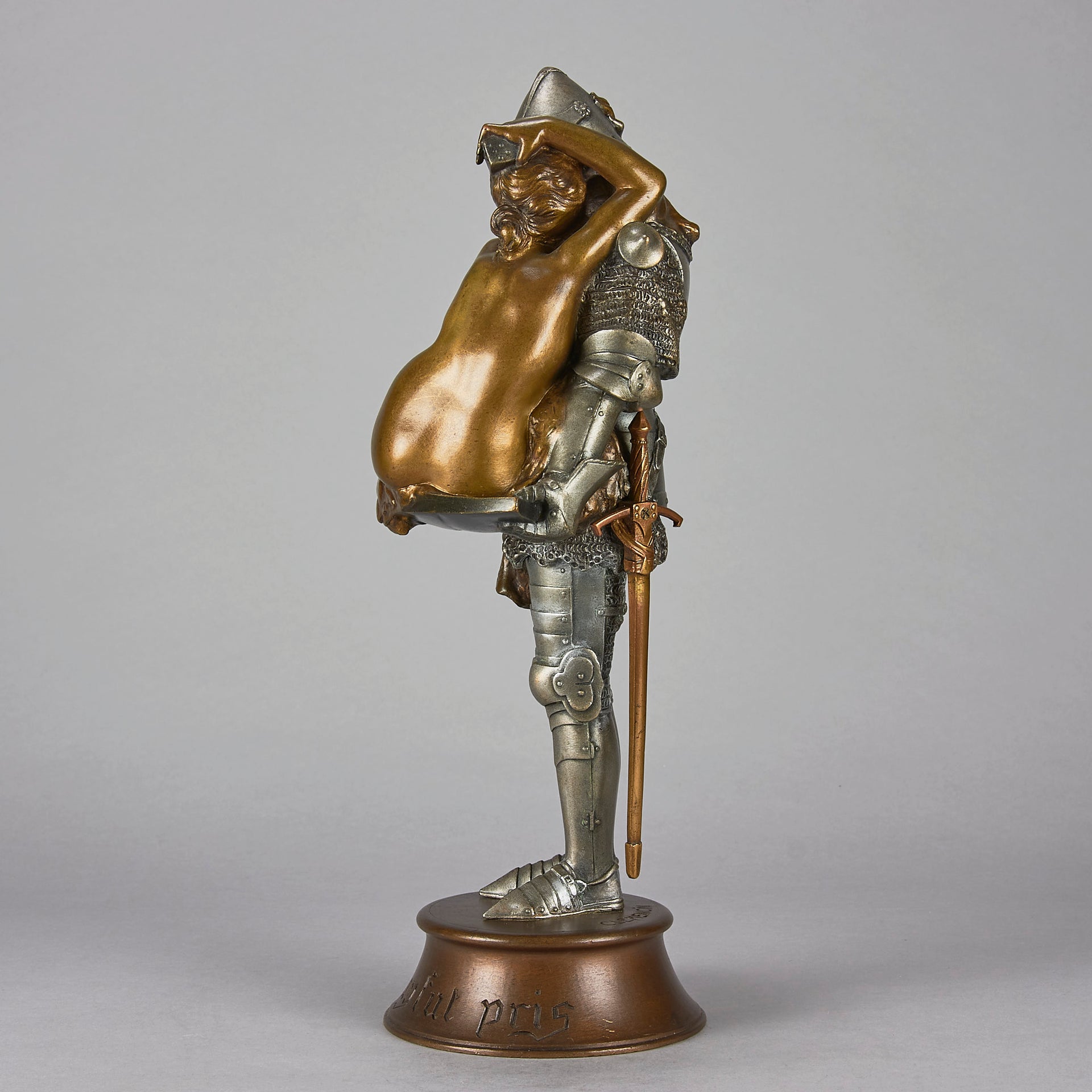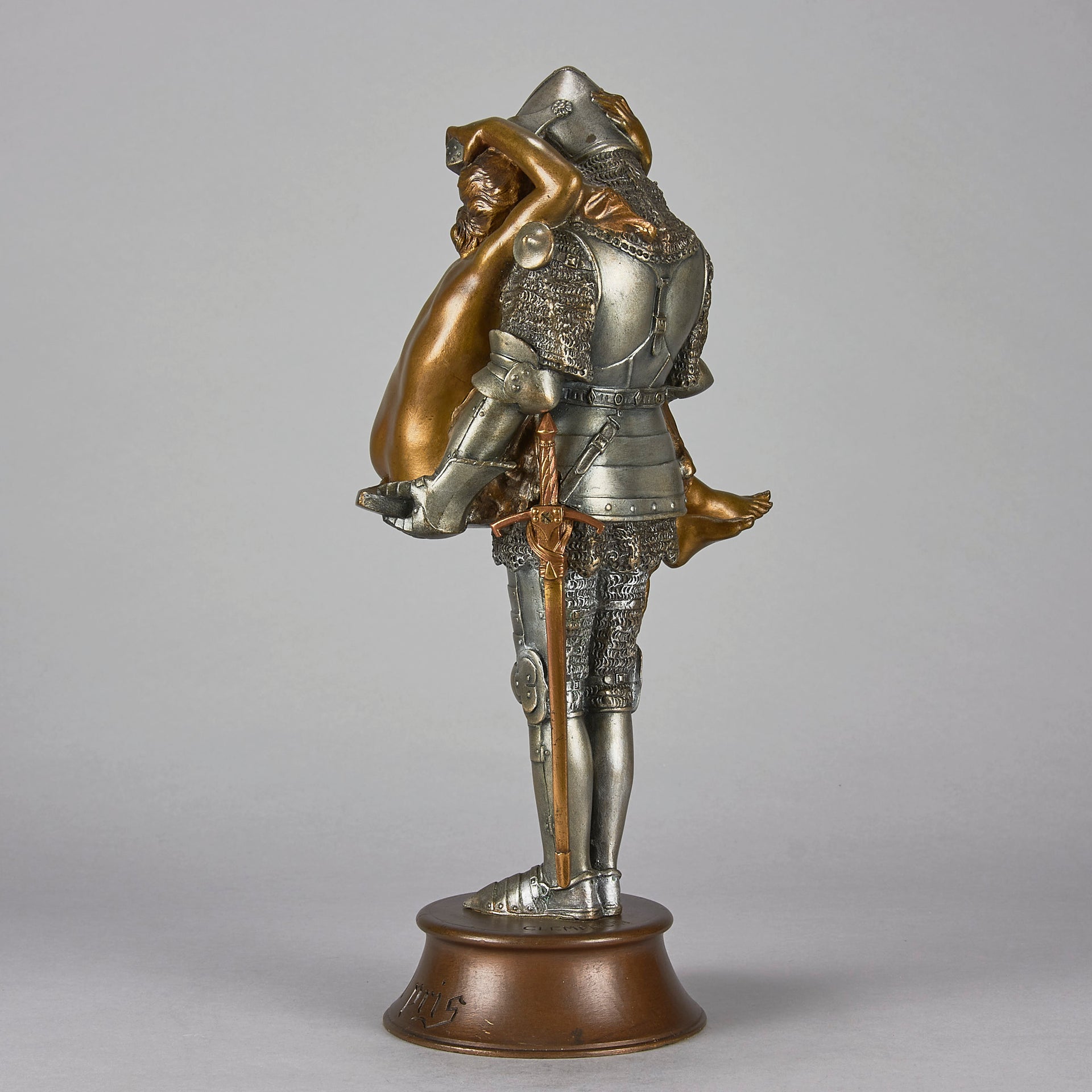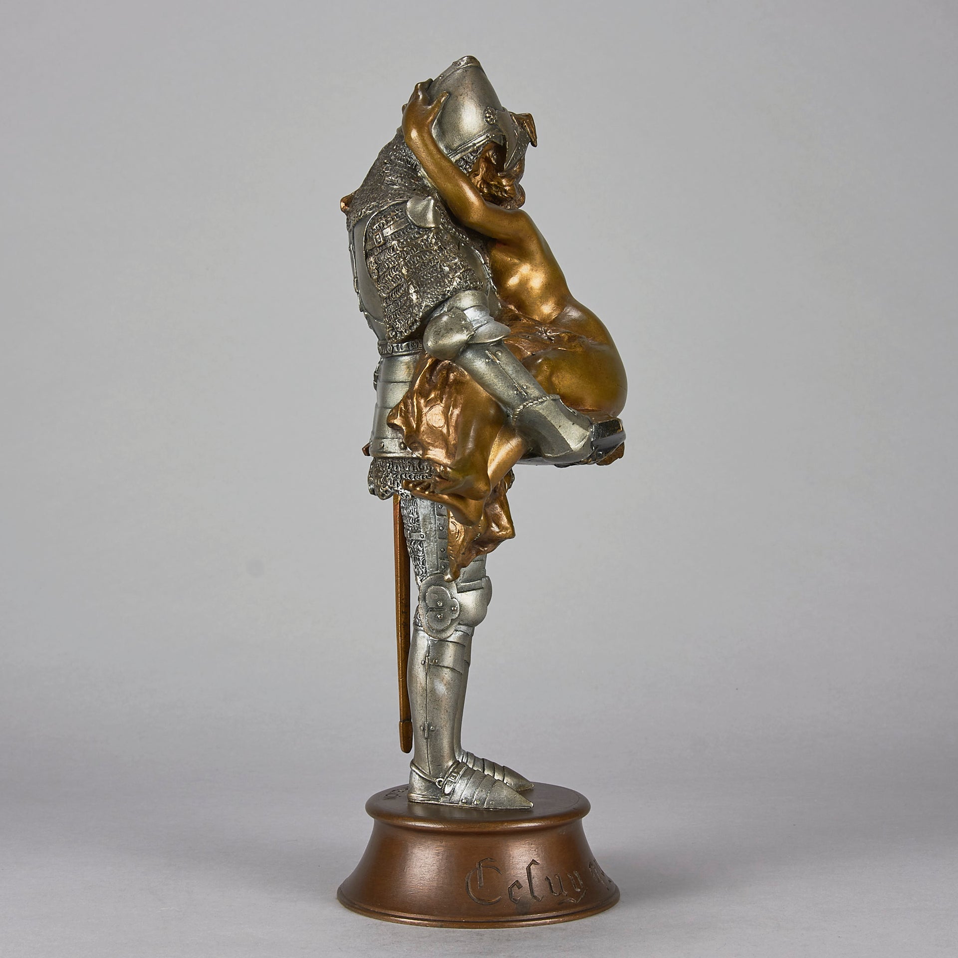 An intriguing and romantic silvered and gilt bronze group of a young knight in full armour carrying his beloved naked upon his shield as she lifts his visor delicately kissing and embracing him to welcome him home from his long travels. The bronze with crisp detail and good colour, signed Clemencin and inscribed with title to the front of the integral circular base. The title meaning is 'He Who Was Taken' and epitomises how the love of a woman can capture a man's heart more than the thrill of battle and deeper than the excitement of war. A charming subject that will also 'capture the heart' of its admirer.