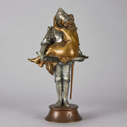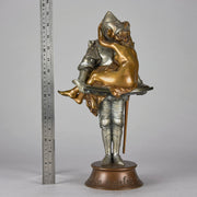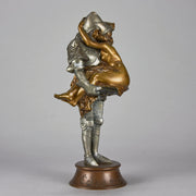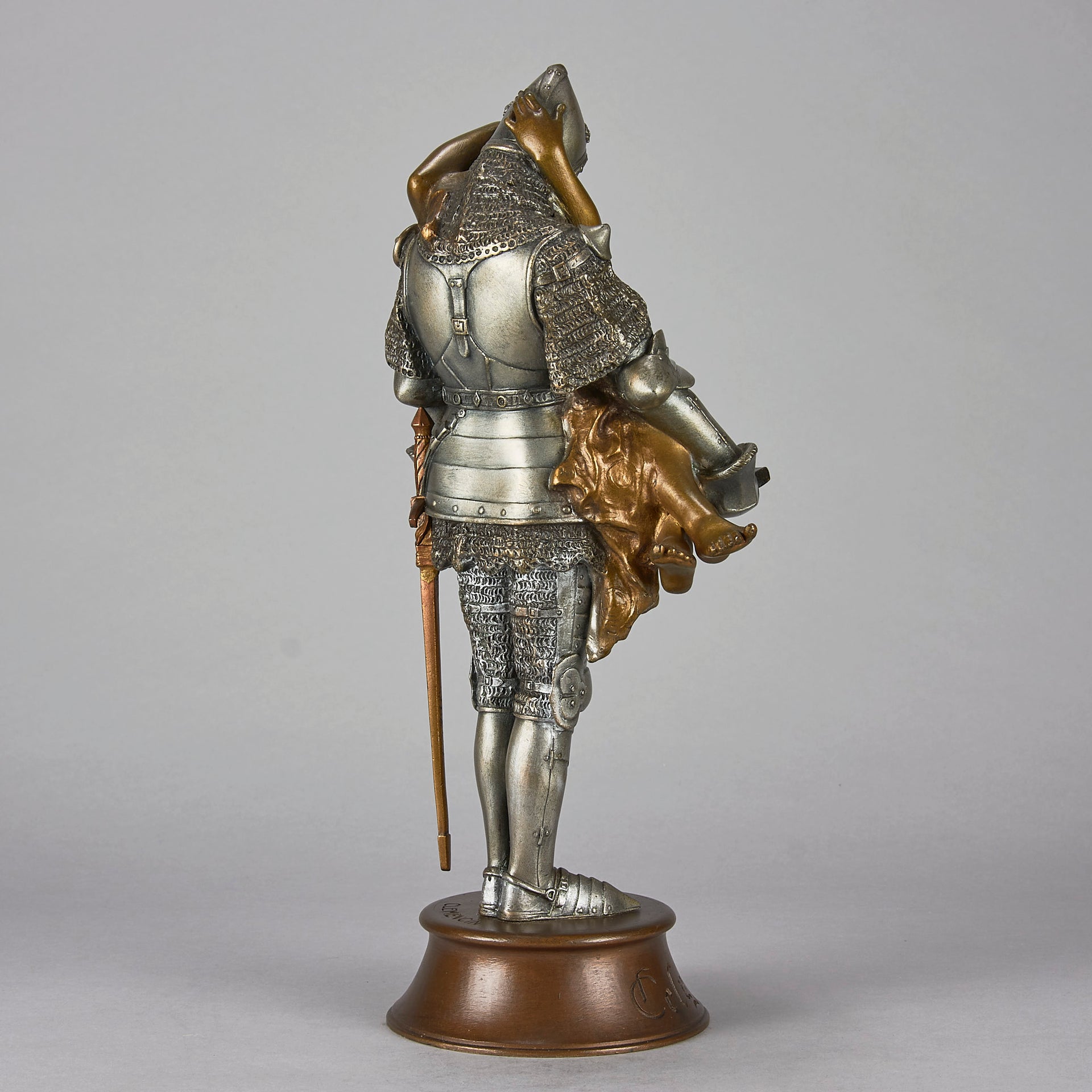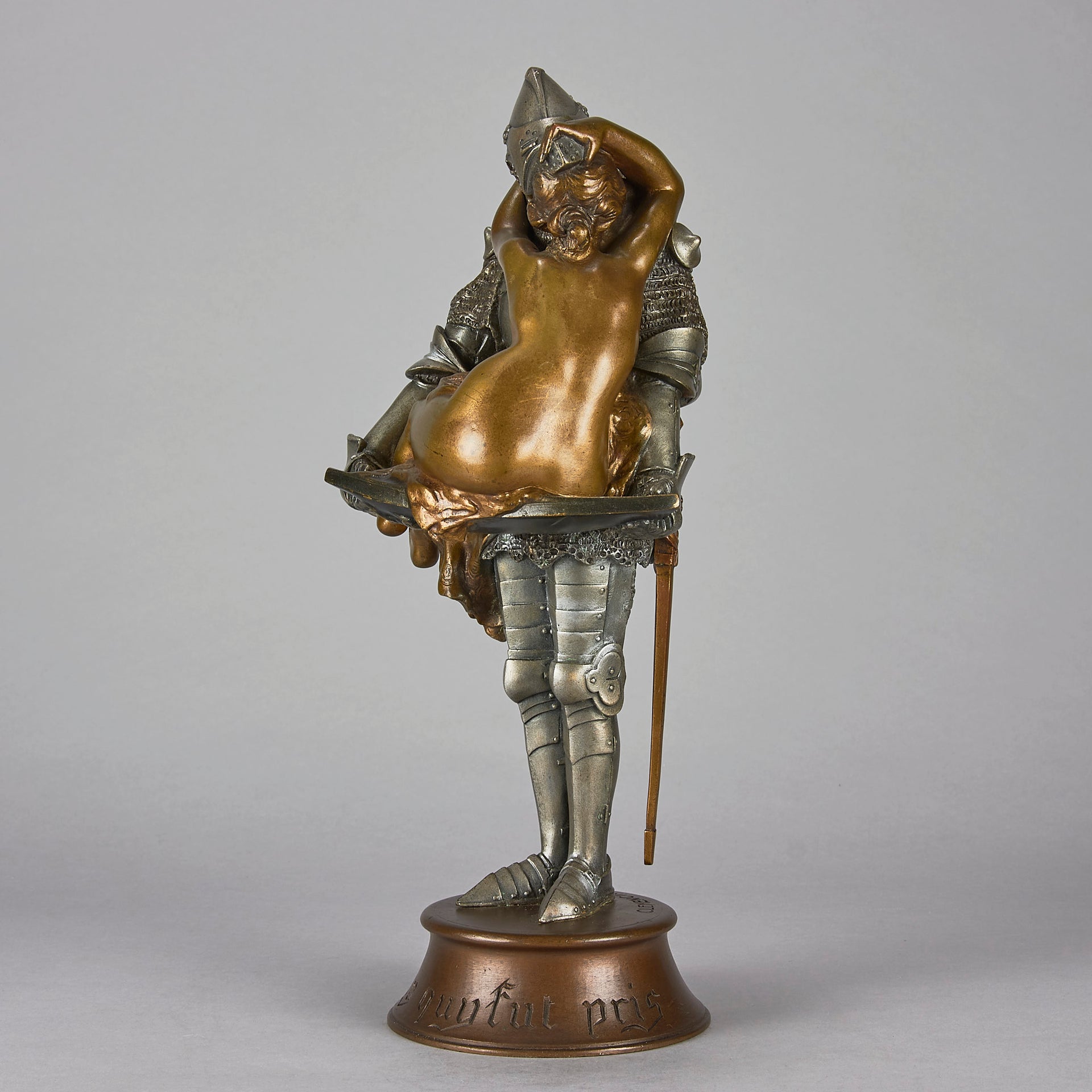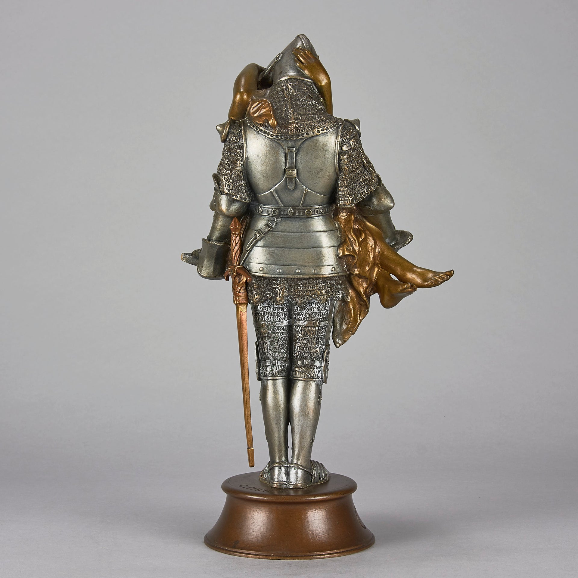An intriguing and romantic silvered and gilt bronze group of a young knight in full armour carrying his beloved naked upon his shield as she lifts his visor delicately kissing and embracing him to welcome him home from his long travels. The bronze with crisp detail and good colour, signed Clemencin and inscribed with title to the front of the integral circular base. The title meaning is 'He Who Was Taken' and epitomises how the love of a woman can capture a man's heart more than the thrill of battle and deeper than the excitement of war. A charming subject that will also 'capture the heart' of its admirer.