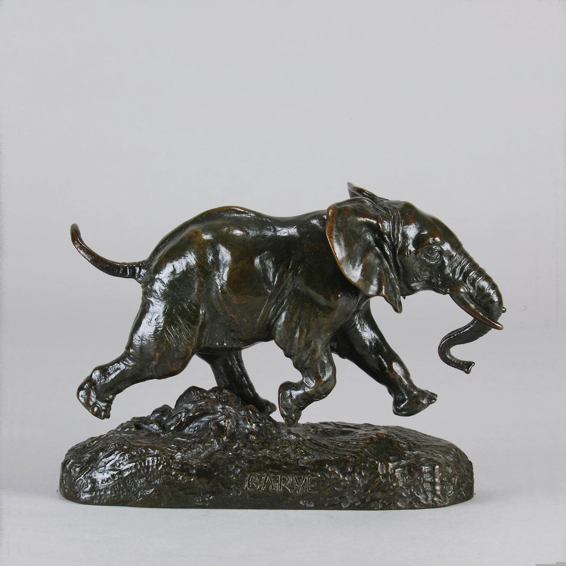 A dramatic mid19th Century animalier bronze study of a charging elephant modelled with wonderful intuition and skill. The surface has a rich autumnal patina with black, green, brown and a deep orange hue and excellent hand chased detail, signed Barye.