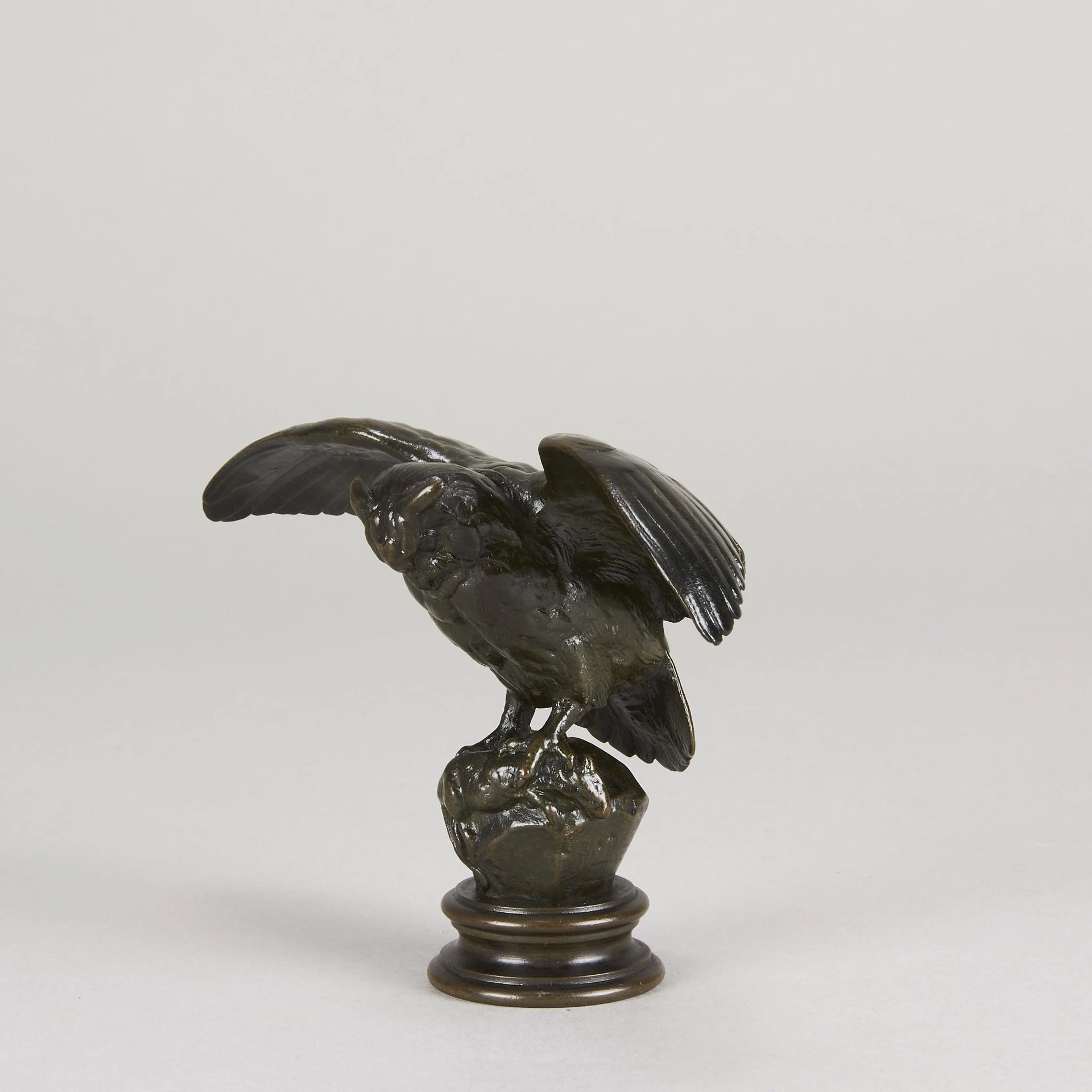 An excellent late 19th century bronze study of an owl with its wings outspread and a mouse in the clasp of its claws exhibiting rich brown, orange, black and green 'autumnal' patina and fine hand finished detail, raised on a bronze base and signed Barye