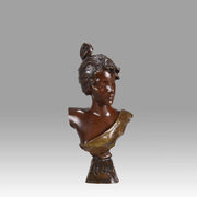 Attractive late 19th Century French Art Nouveau bronze bust of a young beauty in demure pose, exhibiting good hand finished surface detail with deep rich red, gold and brown patina, raised on integral base, titled and signed E Villanis.