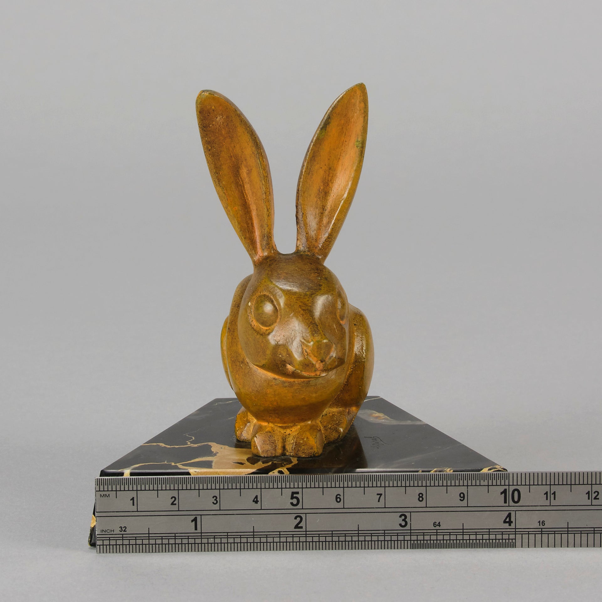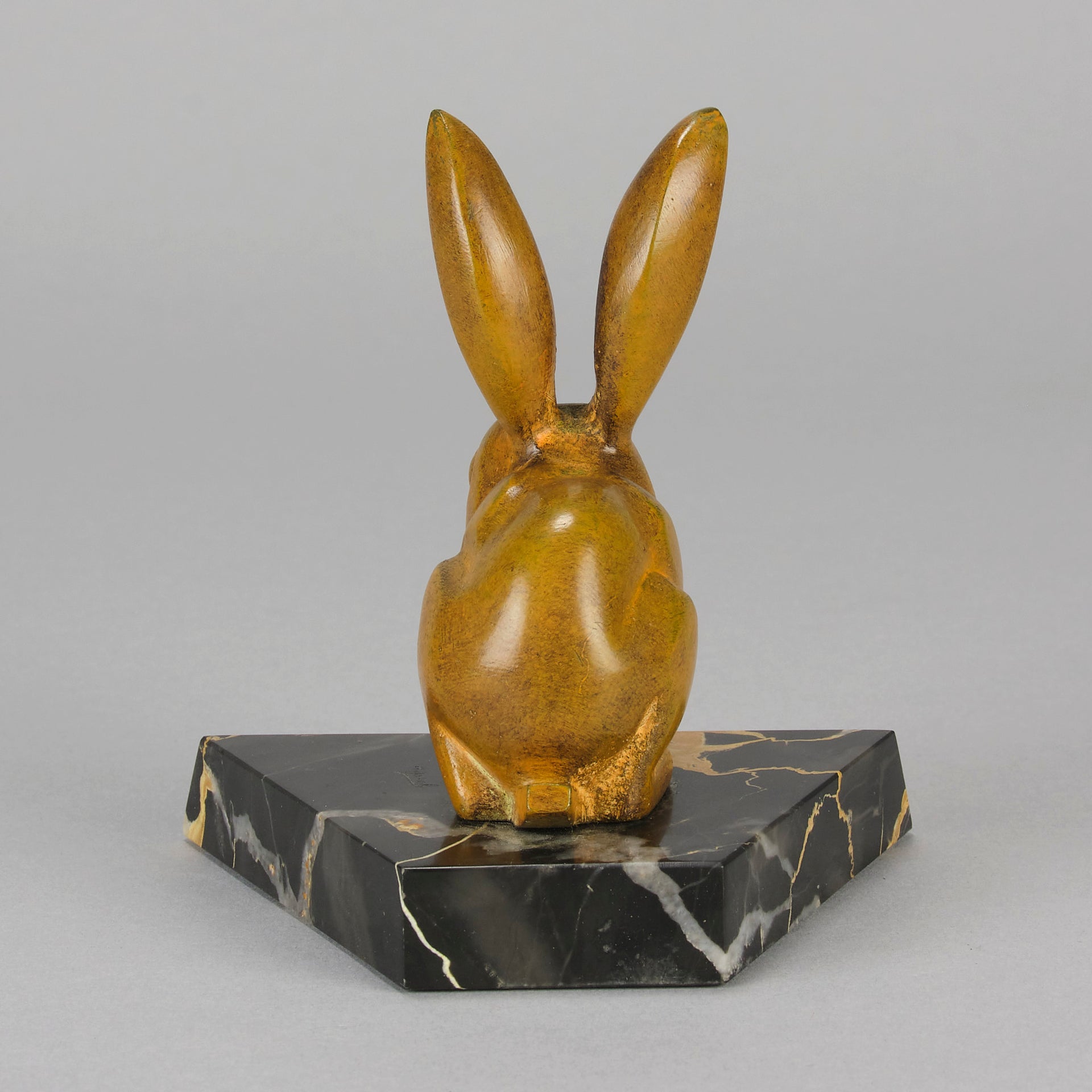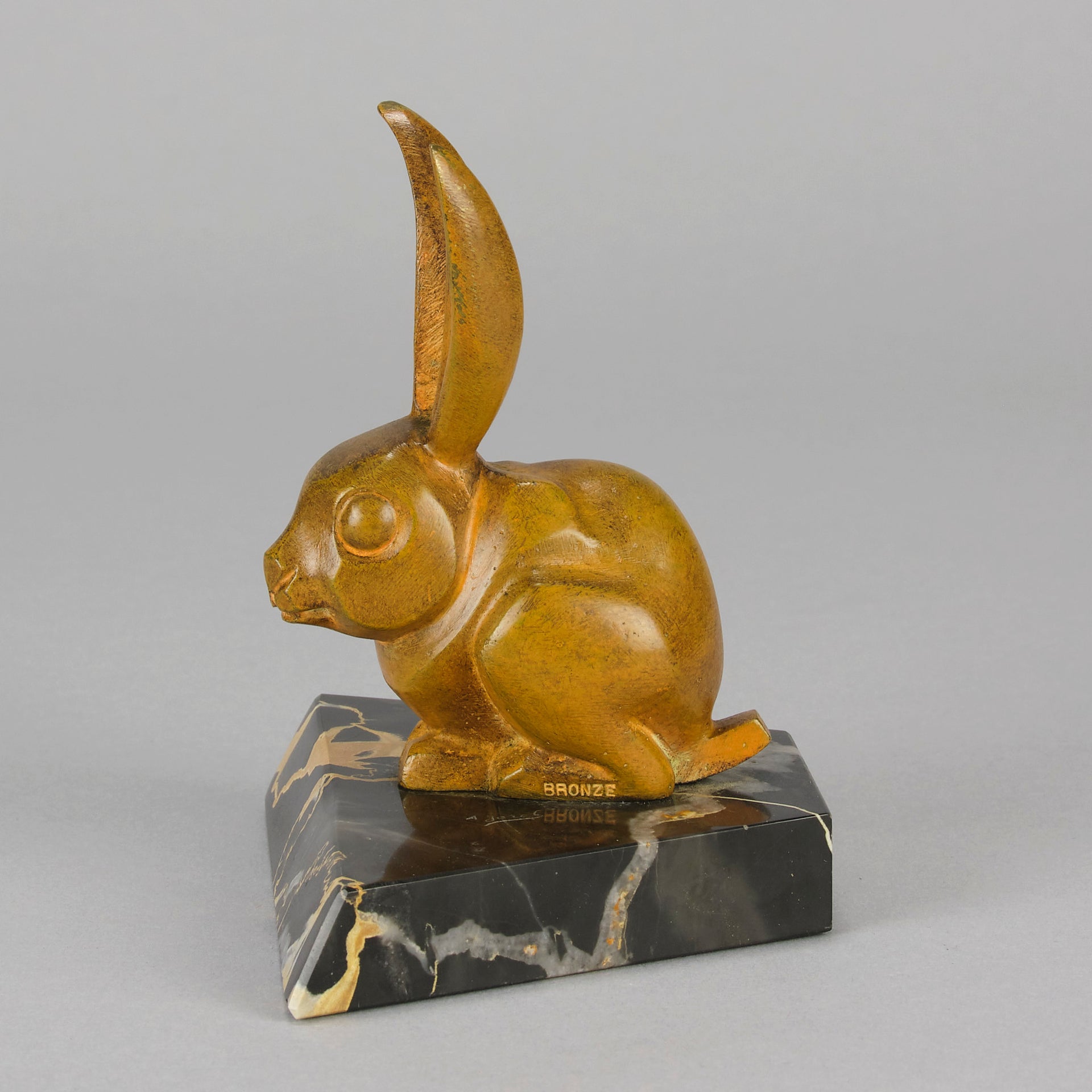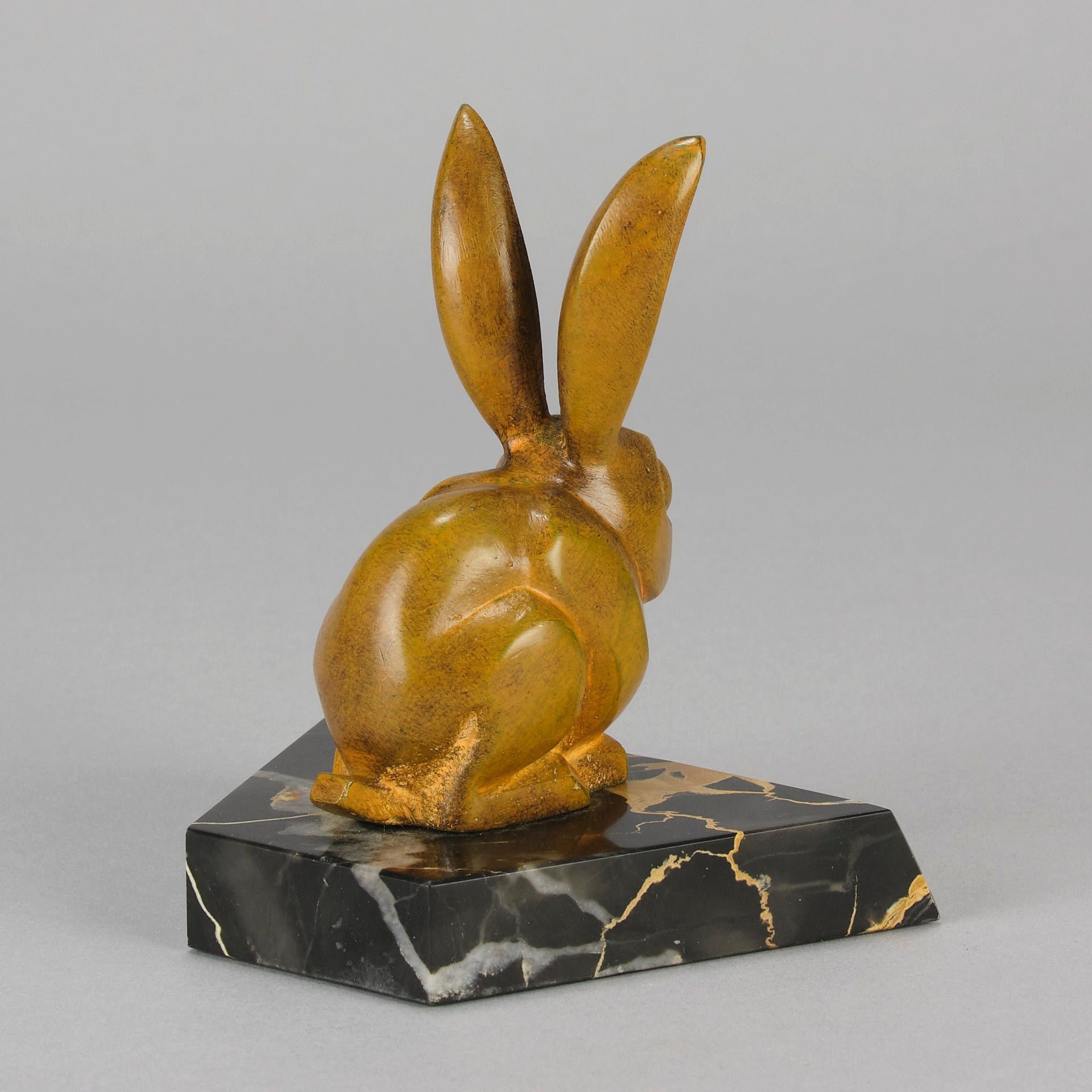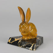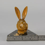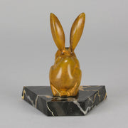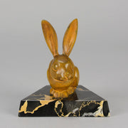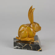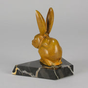 A striking early 20th Century bronze study of a an alert bunny with very fine rich orange/ brown patina and good surface detail, raised on a shaped portoro marble base and signed