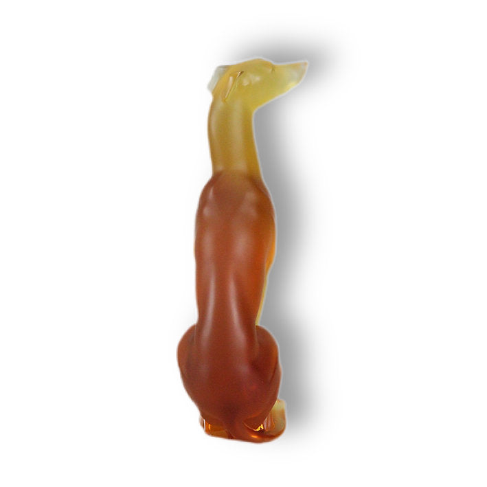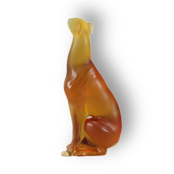 An outstanding golden amber crytal glass study of a greyhound sitting proudly with it's nose slightly raised, signed Lalique France and numbered from the limited edition of 150.