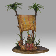 From the 17th Century onwards it was customary for the young Victorian gentleman to go on the obligatory tour of the East – the Grand Tour – as an educational rite of passage. Visiting countries and experiencing customs they had only ever heard about in stories, these young men were keen to show their families mementos of their experience, especially the lavish subjects of the Middle Eastern Arab world. The return trip would usually include a visit to Vienna, and here the ‘souvenir’ shops supplied a plethora of beautifully crafted sculptures with an Orientalist Arab flavour. These were often acquired to show their friends and families images of their travels. Bergman was noted for his detailed and colourful work and he produced a huge number of Orientalist subjects to cater for this market including this Arab Tent Lamp.