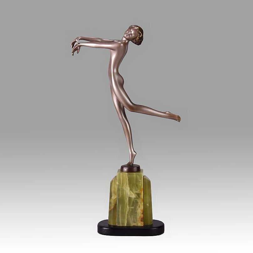 A striking early 20th Century Austrian cold painted bronze figurine of a naked energetic Art Deco dancer holding an animated pose, the surface of the bronze with excellent hand finished detail and fine colour. Raised on a Brazilian green onyx and black marble base, signed Lorenzl to the bronze.