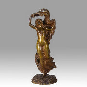 A charming early 20th Century Art Nouveau bronze study of a beautiful dancing lady dressed in a loosely fitted dress and shawl blowing above her head with very fine detail and wonderful rich brown colour, signed