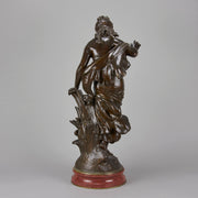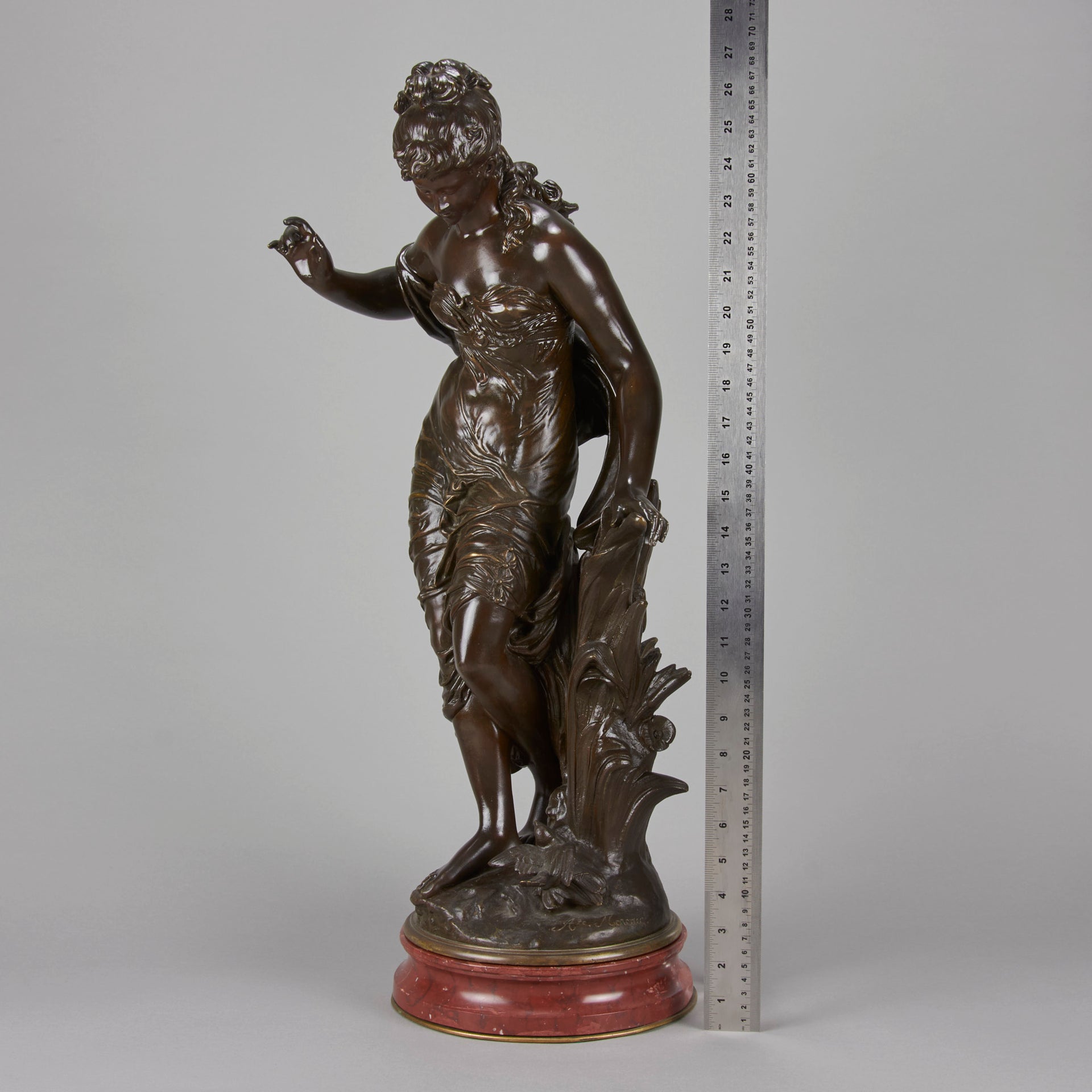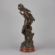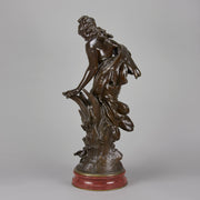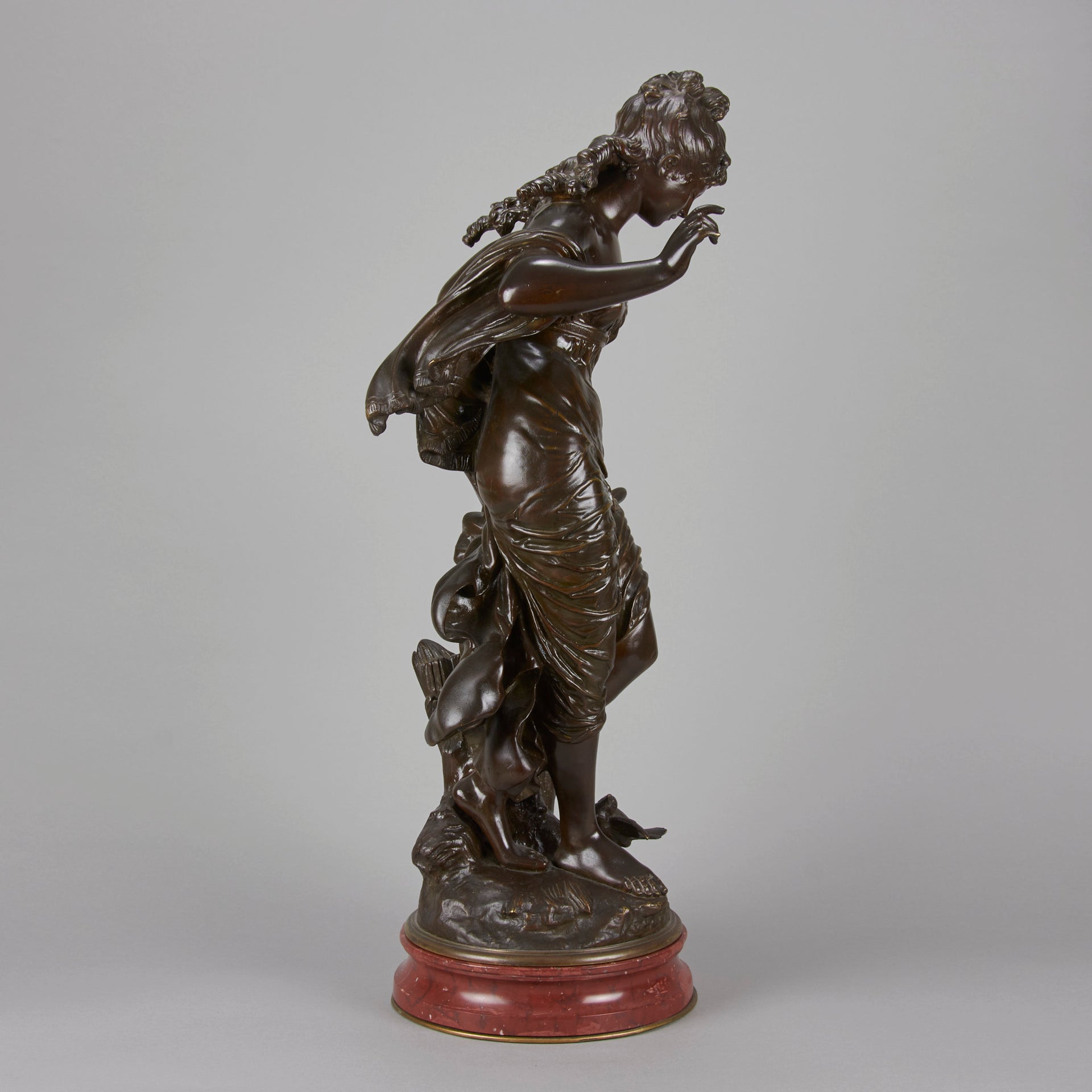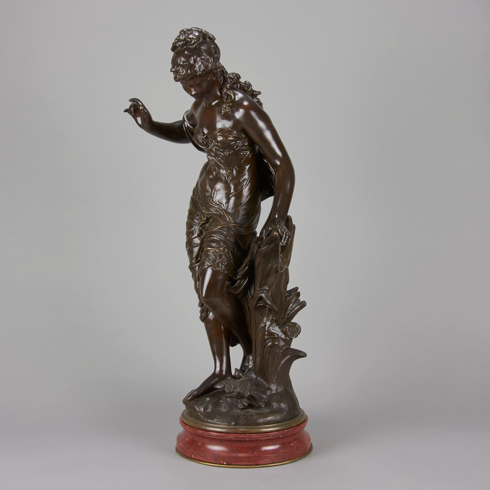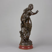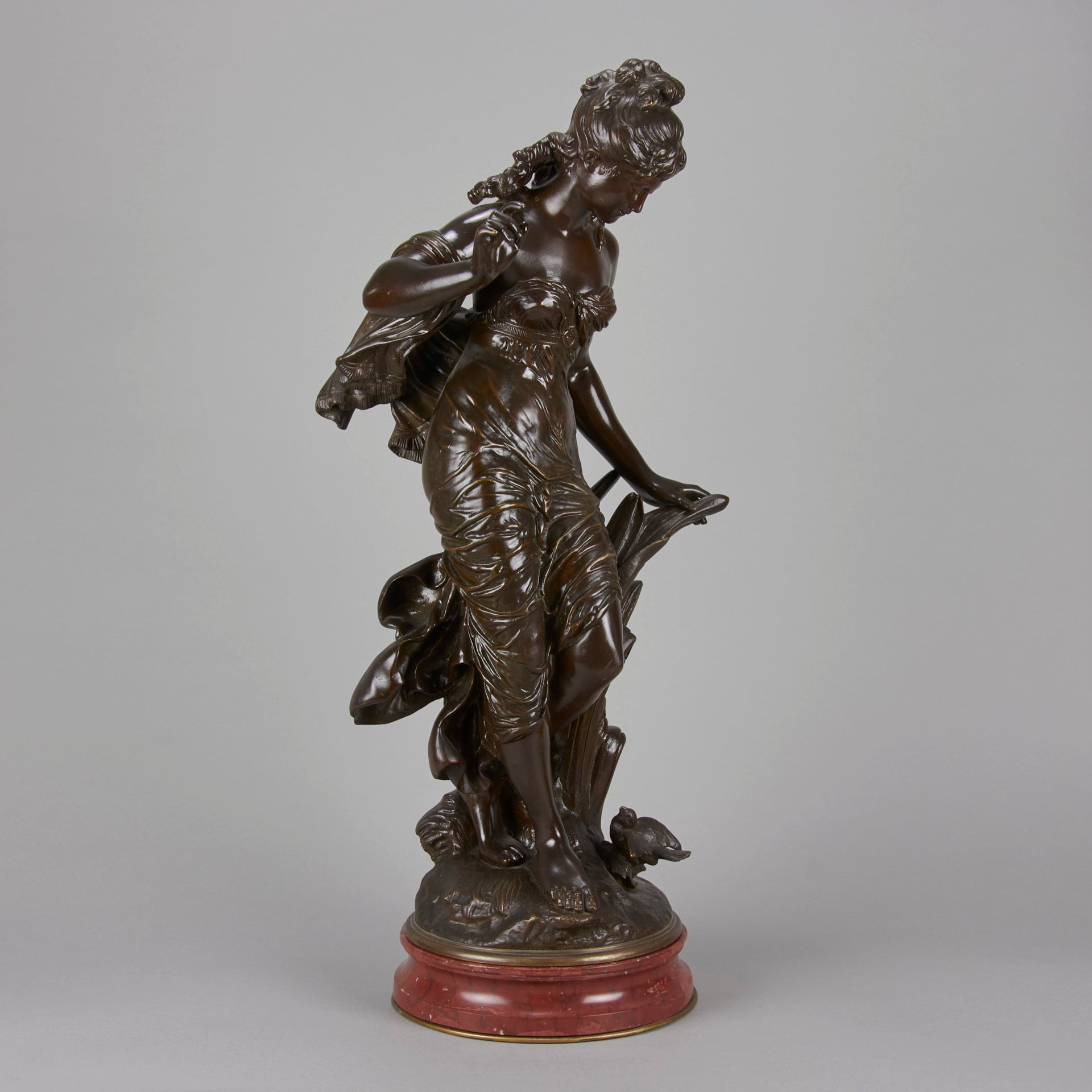 A very fine late 19th Century Art Nouveau bronze figure of a young woman in diaphonous dress, standing by a brook with a bird at her feet. The surface of the bronze with very fine colour and excellent had finished surface detail, signed Aug Moreau. The base with revolving fitting raised on a rouge marble plinth.