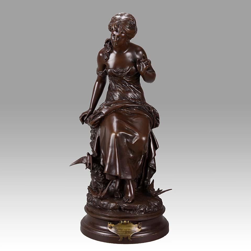 Very pretty late 19th Century Art Nouveau bronze study of a young beauty sat upon a rocky outcrop surrounded by swallows, with excellent rich red/brown patina and fine surface detail. Raised on a bronze base, titled to the fore and signed Aug Moreau