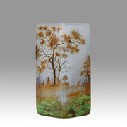 Exceptional rectangular shaped cameo glass vase etched and enamelled with a rich autumn wooded landscape with lake. Signed Daum Nancy and with the Cross of Lorraine.