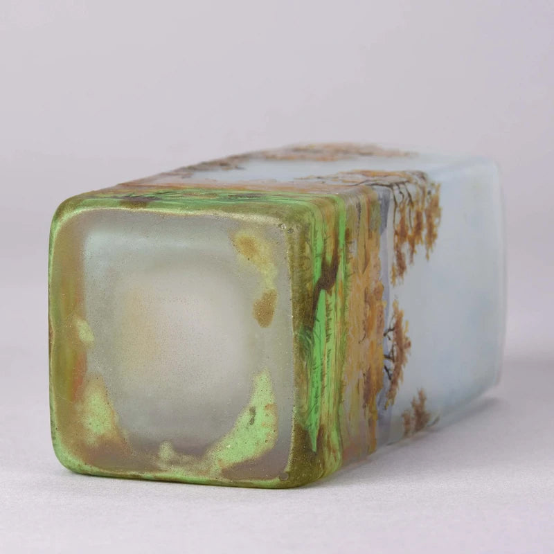 Daum’s unique technique common to all was that a clear vessel was blown with colour only on the inner surface or layer. An acid resist landscape was painted free-hand onto the vessel which was then etched by plunging into a hydrofluoric acid bath. The outer surface was then polished which gave the trees a ‘third dimension’ as the onlooker can see through the clear glass to the inner colour. Then the background was frosted, tricking the eye into thinking it is seeing coloured glass.