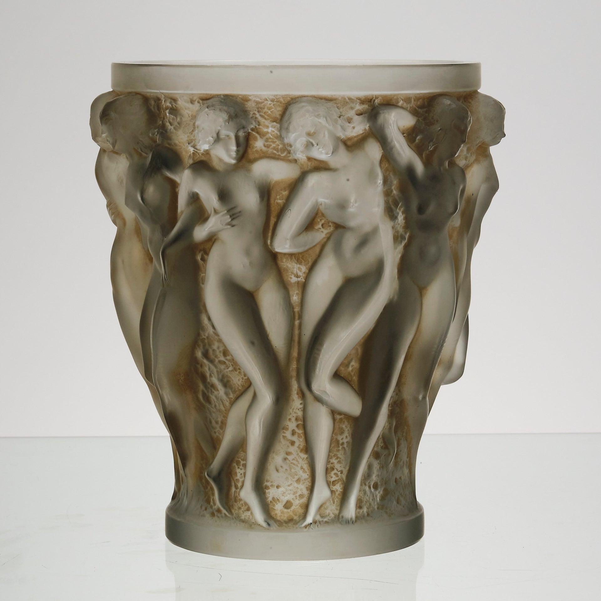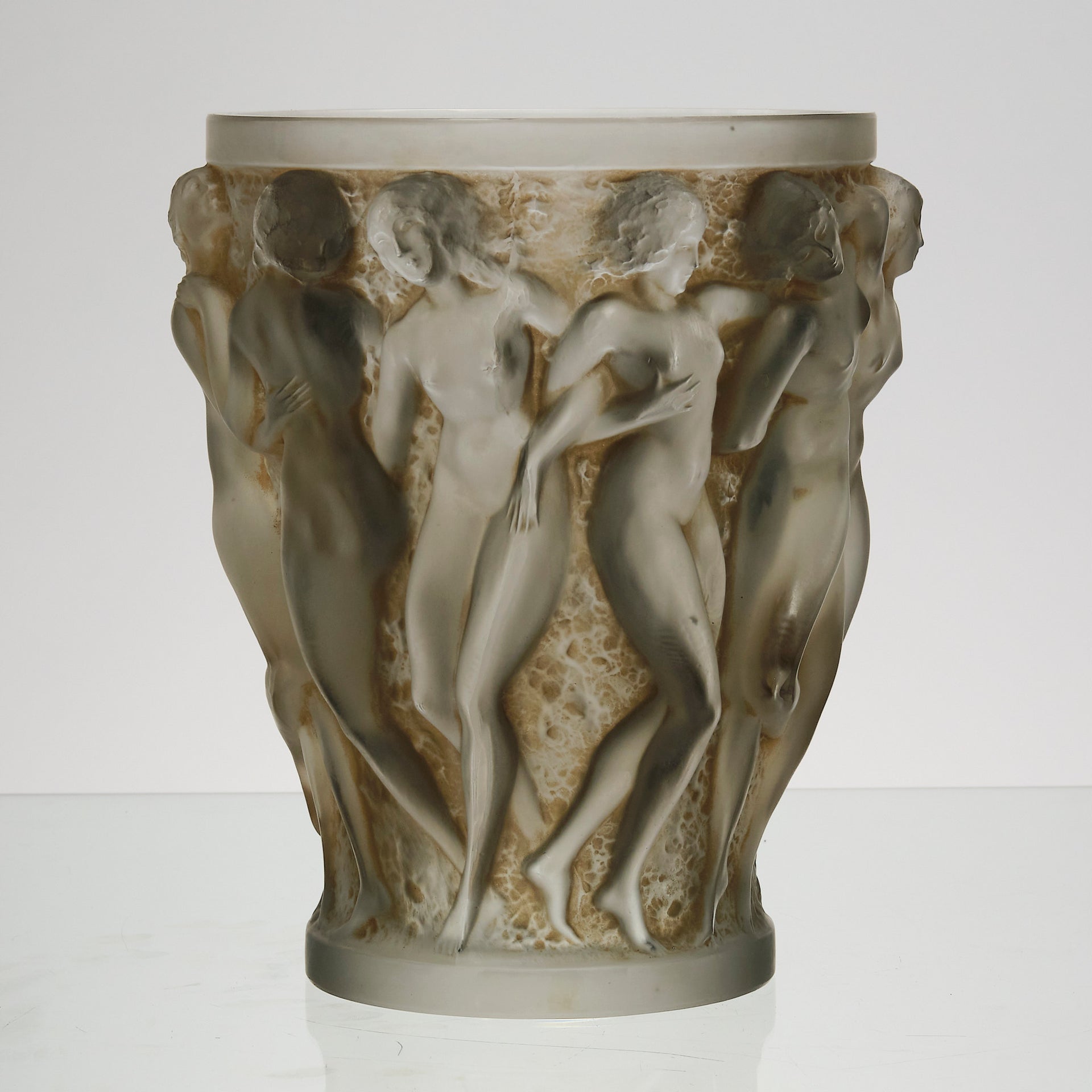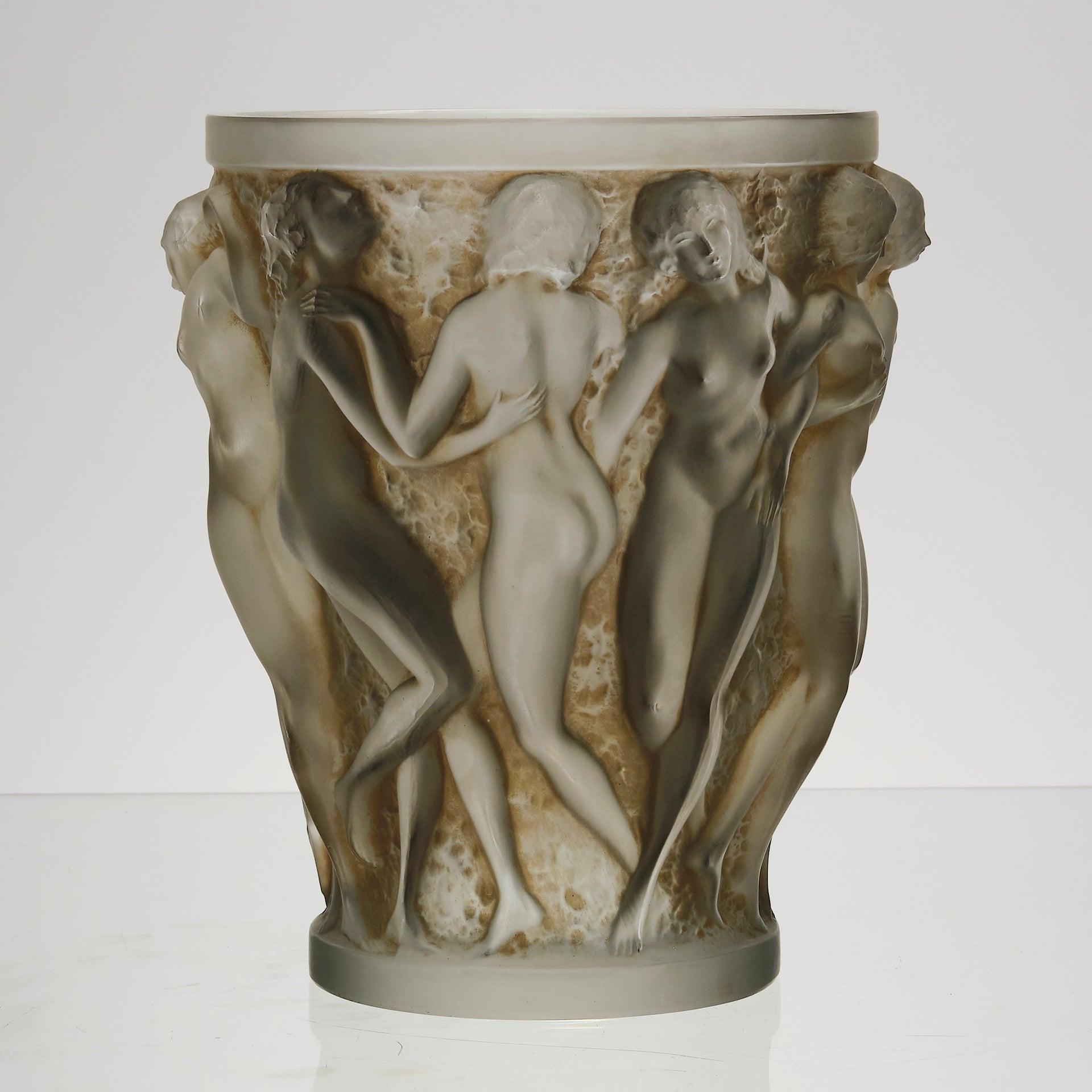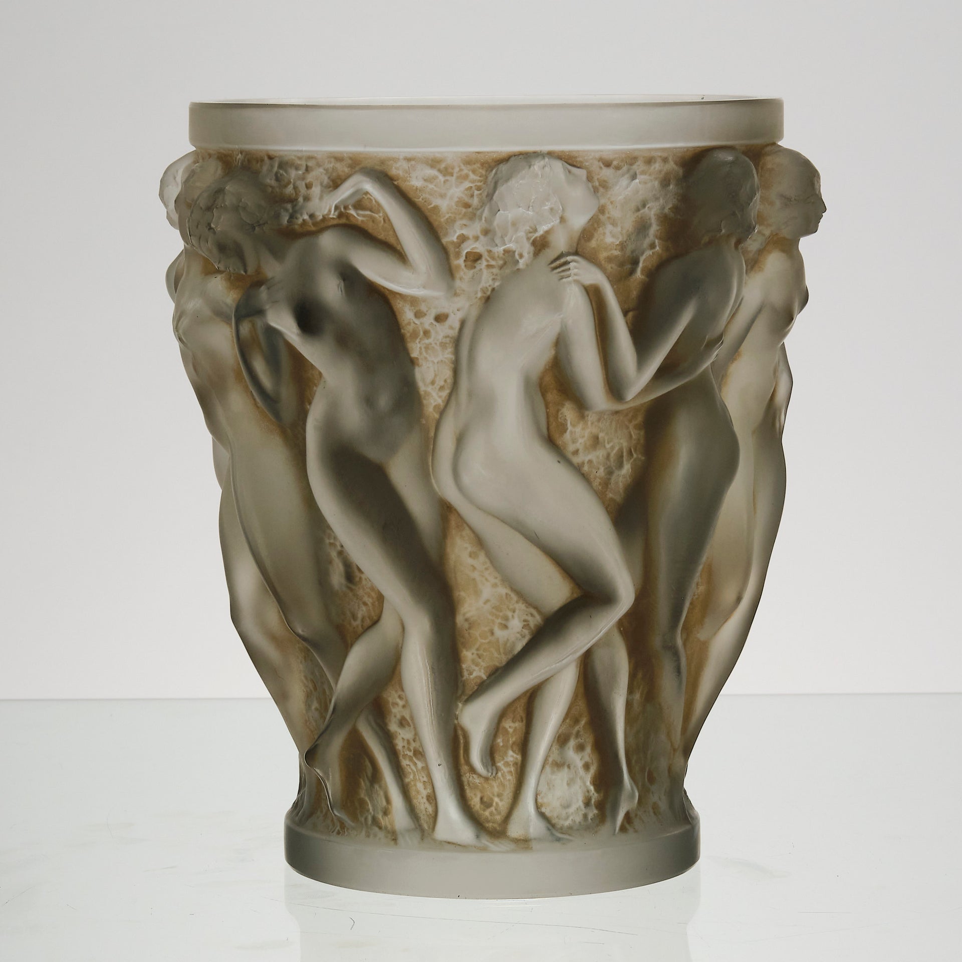 A superb René Lalique Art Deco glass vase decorated with dancing bacchantes in various poses and pairings around the full circumference of the vase, exhibiting an excellent mix of frosted and sepia stained glass with fine hand finished detail, signed R Lalique France